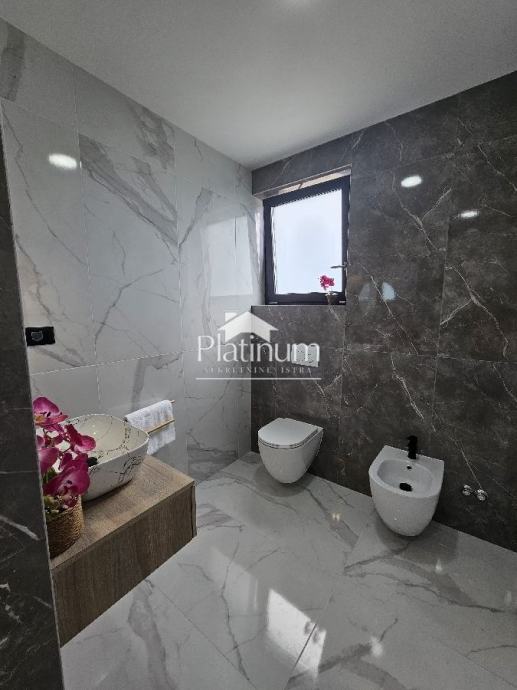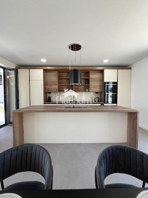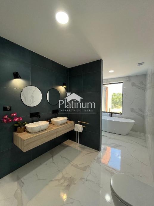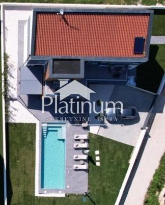 U prizemlju smjestio se prostrani dnevni boravak s kuhinjom i blagovaonom s izlazom na terasu koja vodi do bazena od 40m2,spavaće sobe s kupaonicom gostinjski wc.