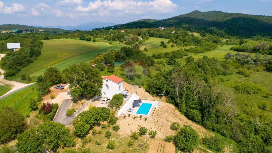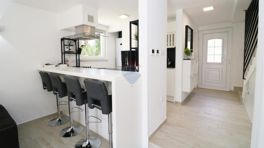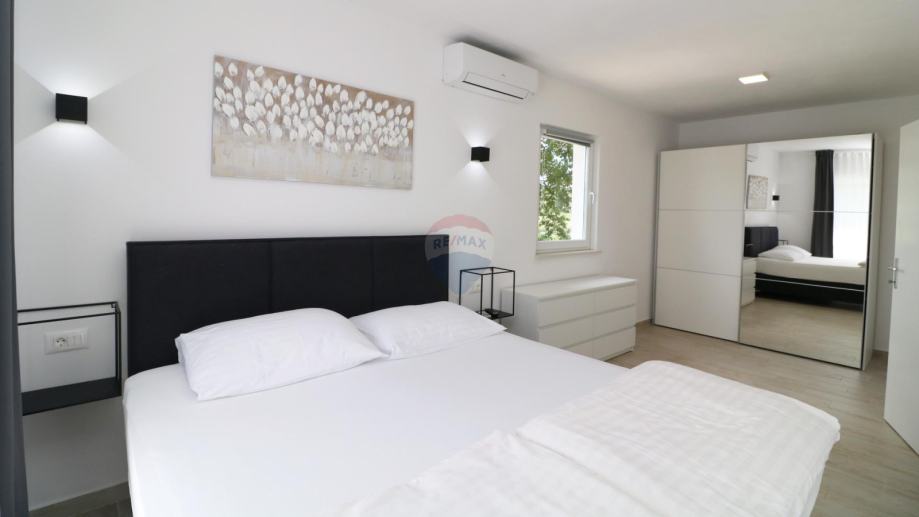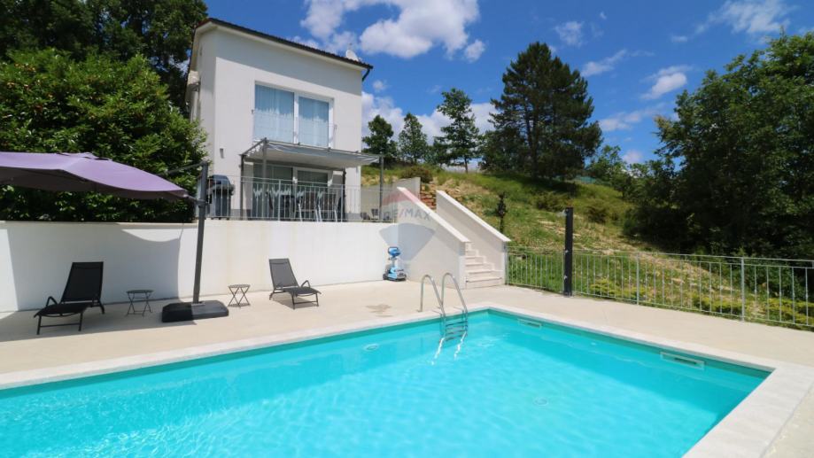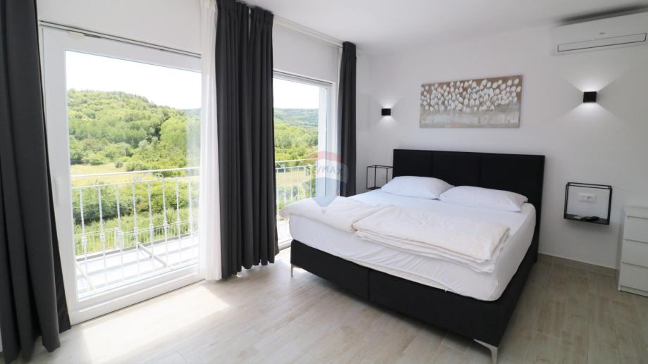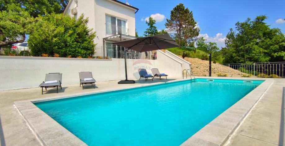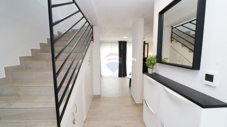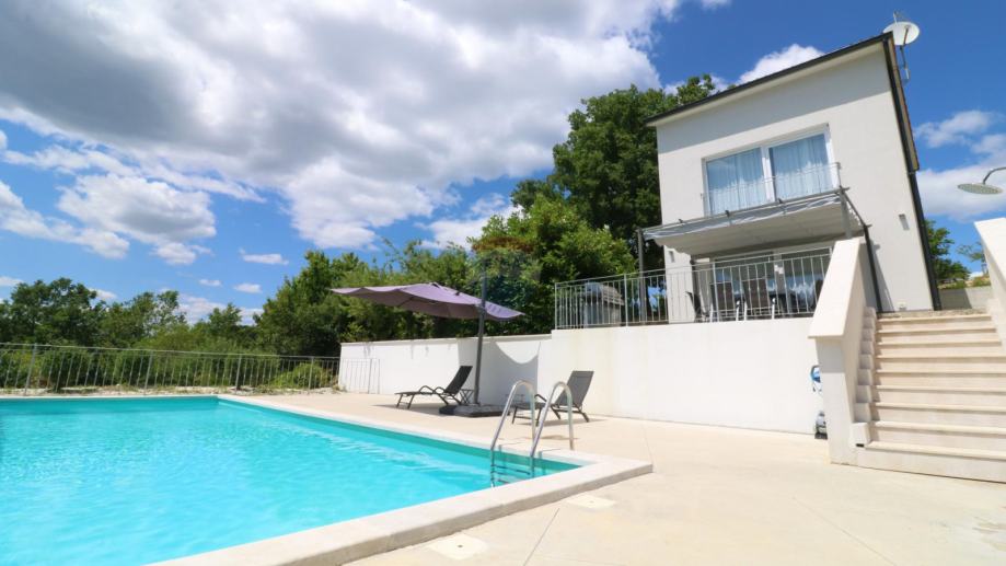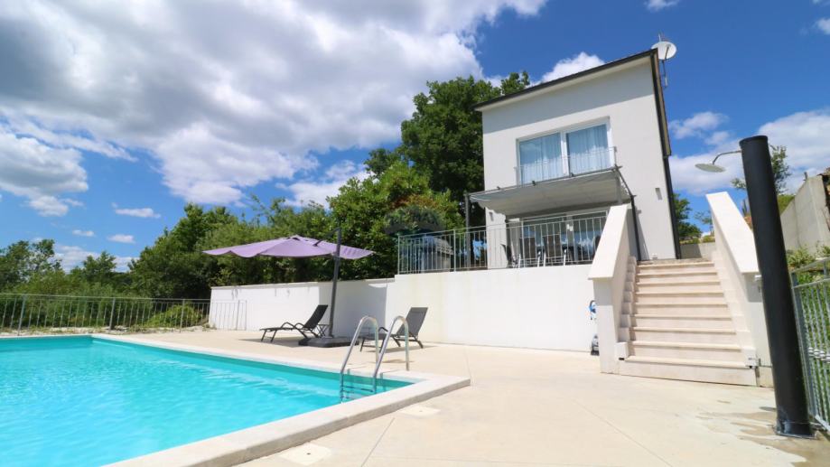 Površine je 100 m2 na tri etaže. U prizemlju se nalazi ulazni hodnik, kupatilo, dnevni boravak s kuhinjom i blagovaonom. Iz dnevnog djela se kroz veliku staklenu stijenu izlazi na natkrivenu terasu s koje se prostite predivan pogled na okolne brežuljke i na bazen. Bazen je površine 40 m2.