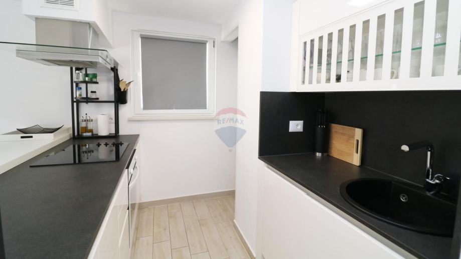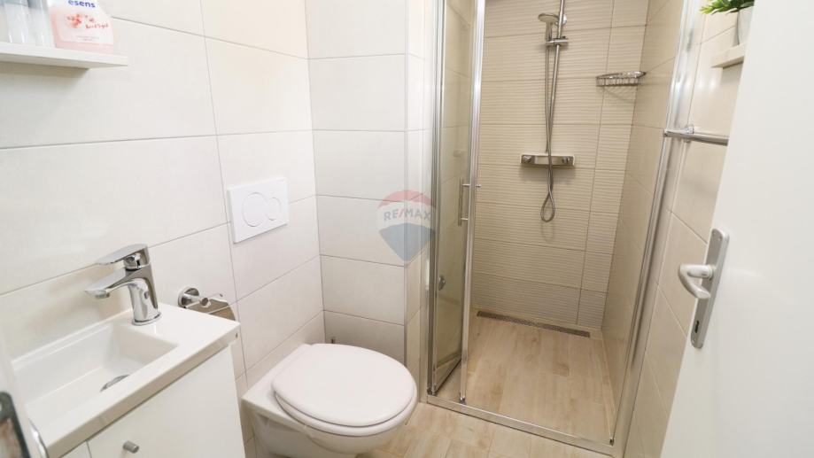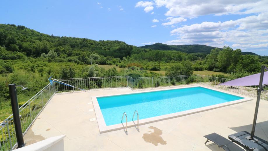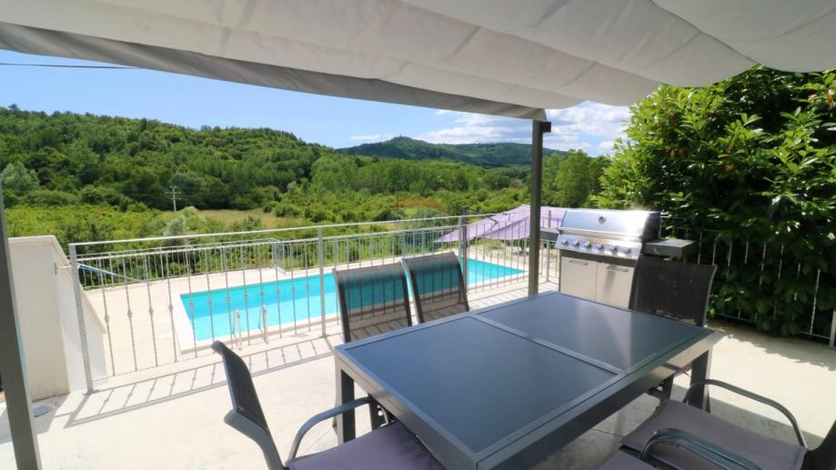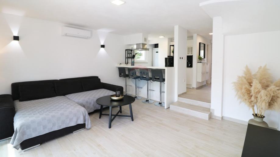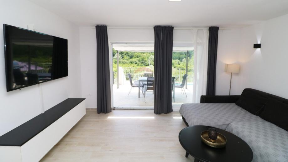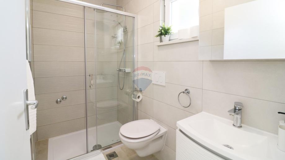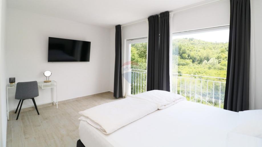 Površine je 100 m2 na tri etaže. U prizemlju se nalazi ulazni hodnik, kupatilo, dnevni boravak s kuhinjom i blagovaonom. Iz dnevnog djela se kroz veliku staklenu stijenu izlazi na natkrivenu terasu s koje se prostite predivan pogled na okolne brežuljke i na bazen. Bazen je površine 40 m2.