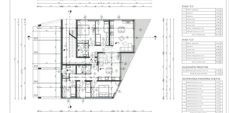 Sastoji se od dvije spavaće sobe,kuhinje+blagavaona+dnevni boravak,kupaonica,hodnik+garderoba,natkrivena terasa,parking.