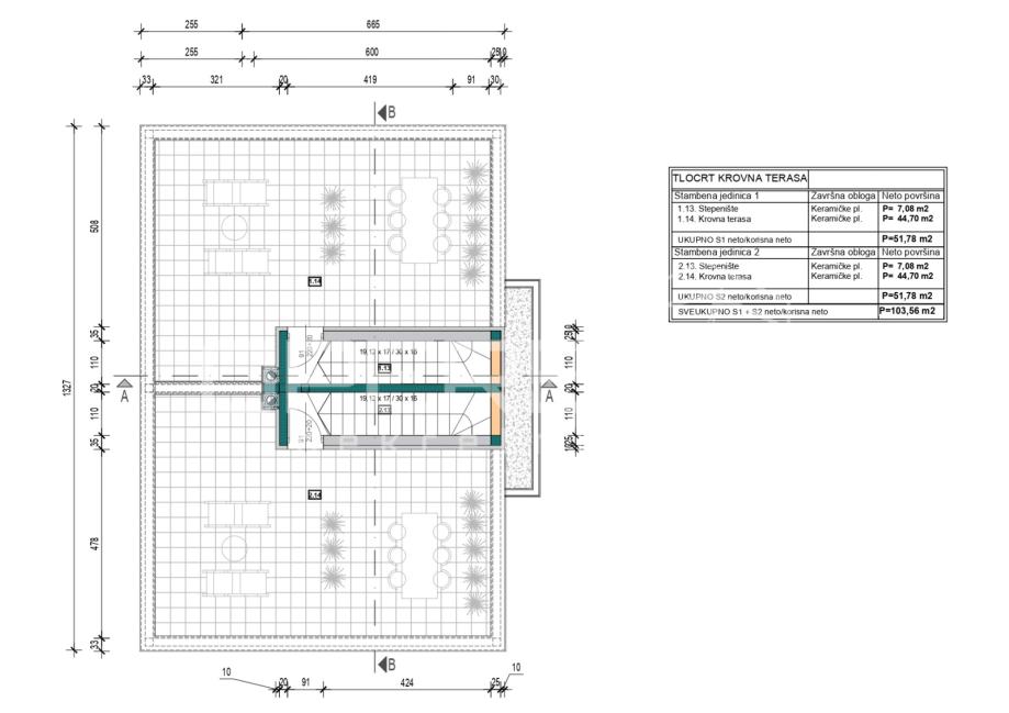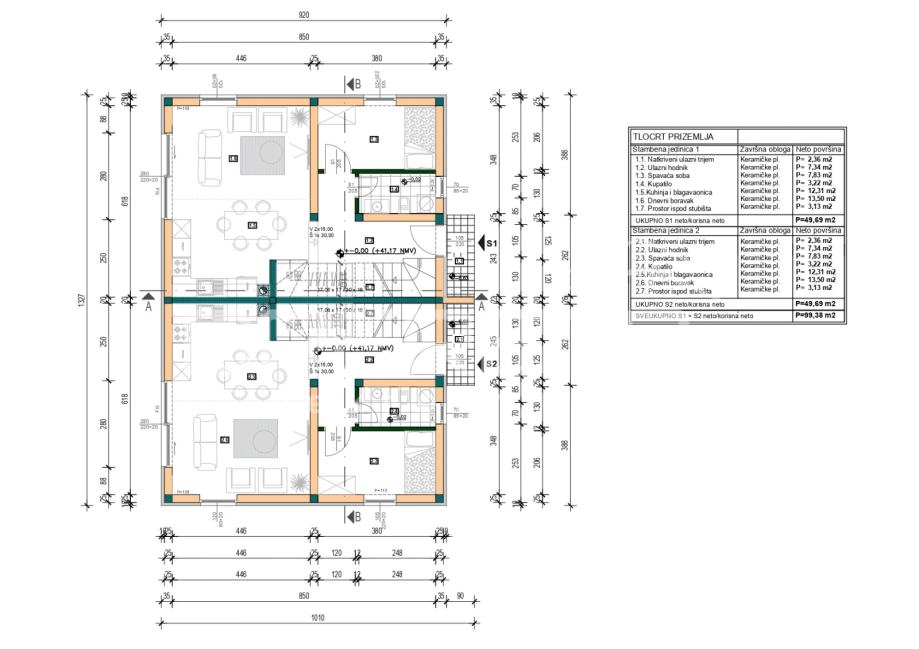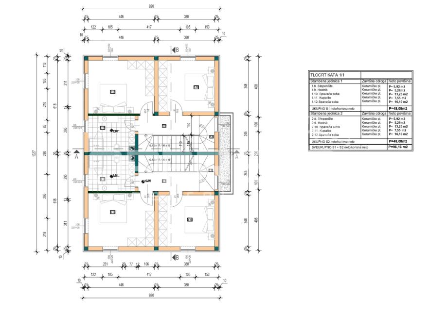Kuća(stan) - S1 i S2, svaka neto reducirane površine 116 m2, od čega je stambene površine 98 m2.