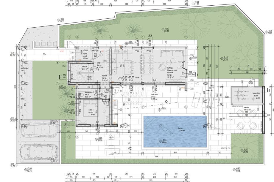 Vila se proteže na dvije etaže. Prizemlje se sastoji od natkrivenog ulaza od 3,51 m², koji vodi u prostrani hodnik od 8,55 m². Središnji dio prizemlja čini prostrana dnevna zona s kuhinjom, blagovaonicom i dnevnim boravkom otvorenog koncepta, ukupne površine 39,52 m². Iz dnevnog boravka izlazi se na natkrivenu terasu od 21,57 m², koja pruža savršen prostor za opuštanje uz bazen. Na ovoj etaži nalazi se i jedna spavaća soba od 12,80 m², moderna kupaonica od 4,86 m² te praktična ostava od 2,53 m² smještena u neposrednoj blizini kuhinje.