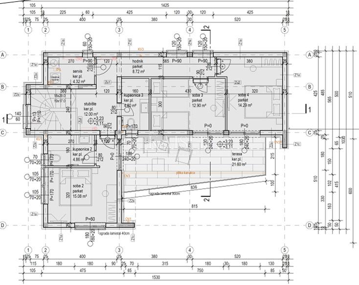 Elegantno stubište vodi na prvi kat, gdje se smjestio hodnik od 12 m², koji na desnoj strani vodi do glavne spavaće sobe površine 15,08 m² s vlastitom kupaonicom od 4,86 m². Dodatni hodnik od 8,72 m² povezuje dvije spavaće sobe – veću od 14,29 m² i manju od 12,90 m², koje dijele veliku kupaonicu od 4,80 m². Sve sobe imaju izlaz na prostranu terasu od 21,60 m², s koje se pruža spektakularan pogled na okolicu. Na ovoj etaži smještena je i tehnička soba od 4,32 m².