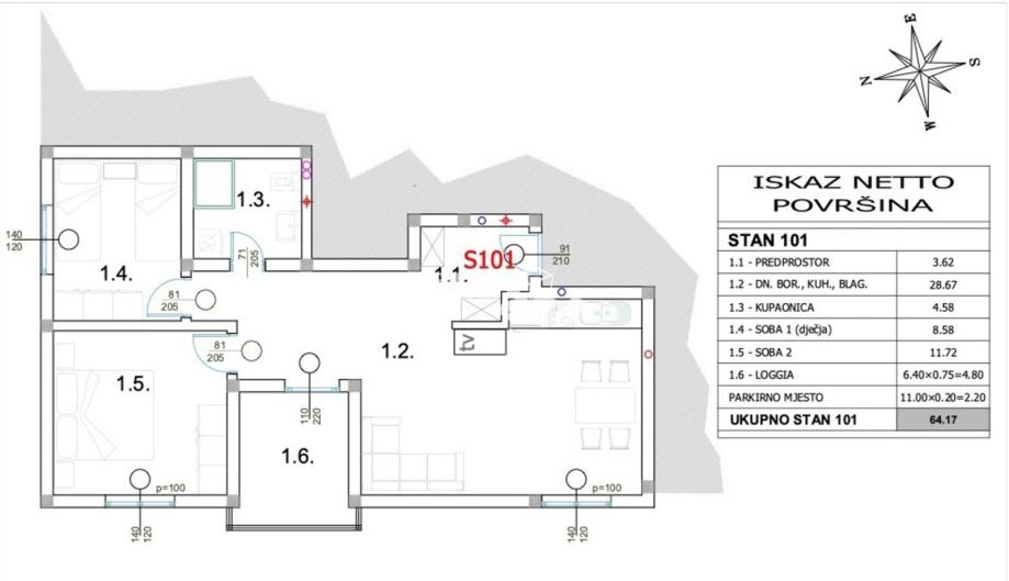 Stan se sastoji od dvije spavaće sobe i dnevnog boravka, a njegovu prostranost dodatno upotpunjuju lođa i lijep pogled prema okolini. Orijentacija stana na istok i zapad omogućava obilje prirodnog svjetla tijekom dana, stvarajući ugodnu i svijetlu atmosferu.