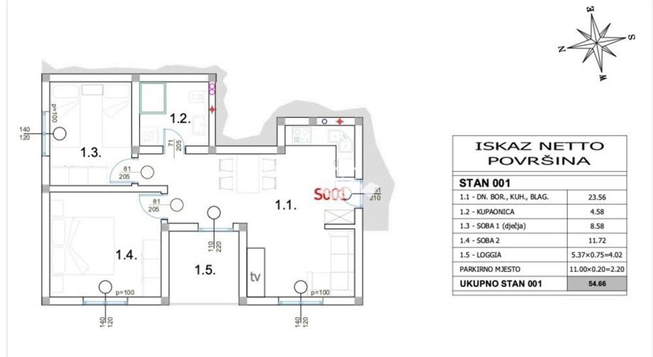 Stan raspolaže s dvije spavaće sobe i dodatnim dnevnim boravkom, što omogućuje funkcionalno korištenje prostora za obitelj ili parove. Orijentacija stana je na istok i zapad, čime se osigurava obilje prirodnog svjetla tijekom dana. Posebnu vrijednost daje lođa, idealna za opuštanje na otvorenom.