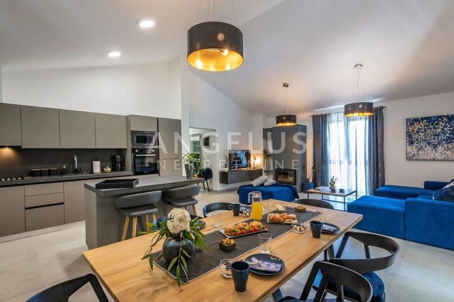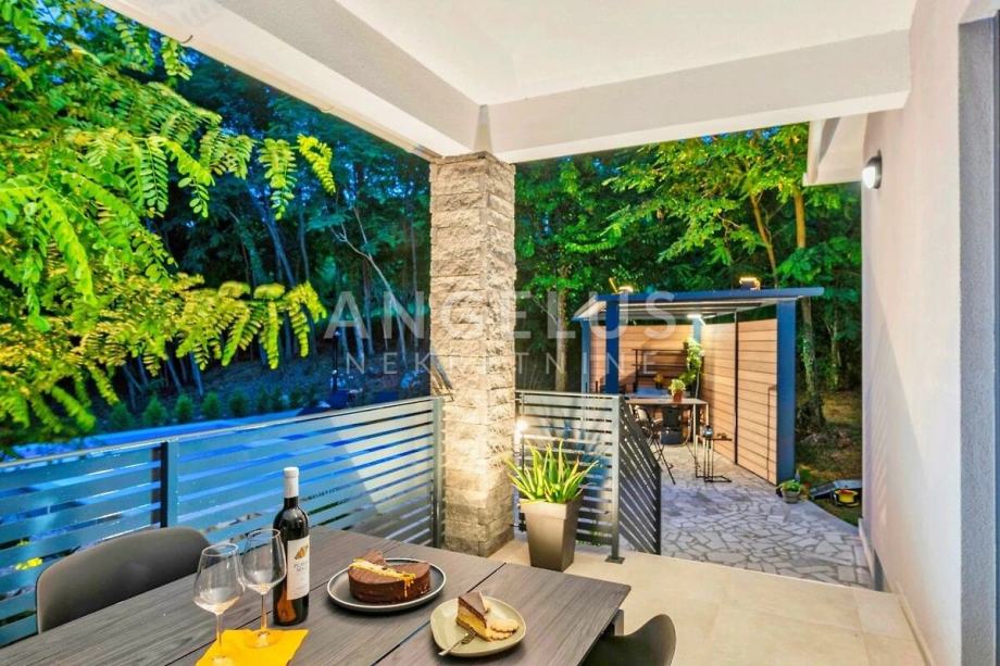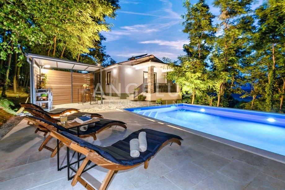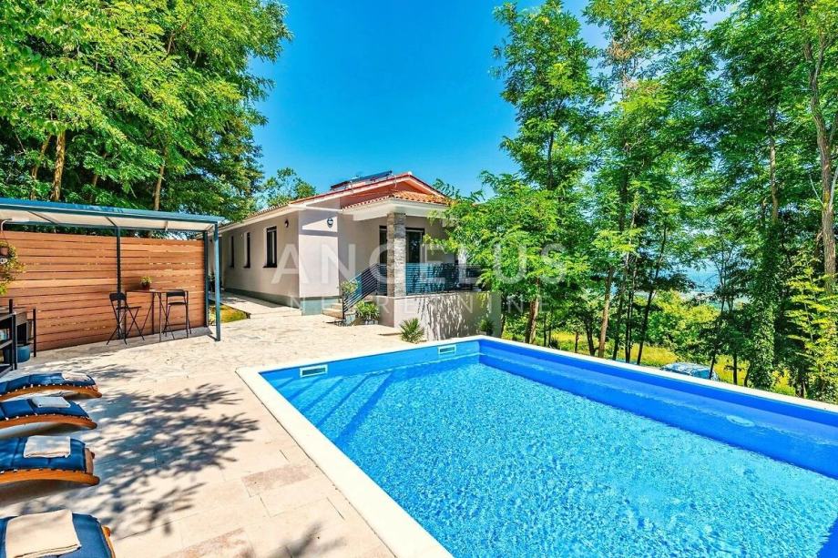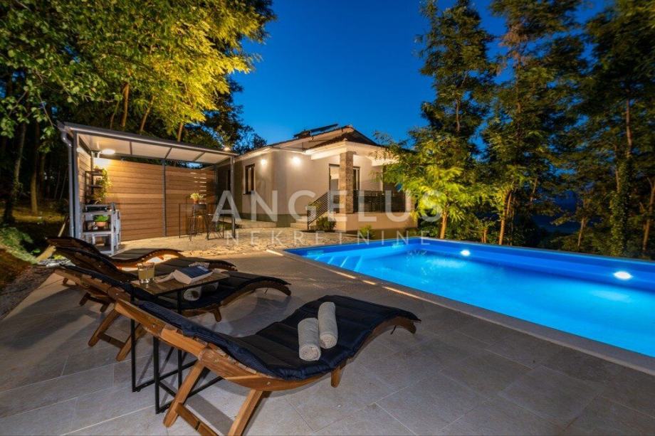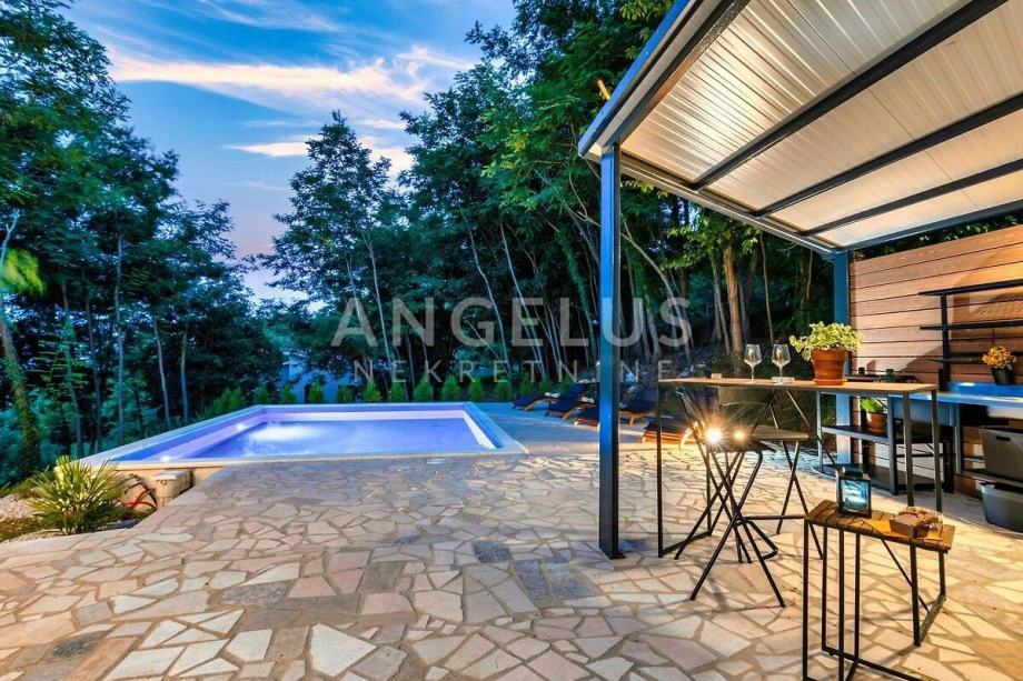 Kuća se sastoji od 3 spavaće sobe i 3 kupaonice uz veliku kuhinju i dnevni boravak u kojem središnje mjesto zauzima kamin za grijanje u zimskim mjesecima i ugođaj. Na udaljenosti od 16 km nalaze se prve plaže kao i park prirode Učka koja je najviša planina istarskog poluotoka u zapadnoj Hrvatskoj. Pruža se uzduž opatijske rivijere na koju se pruža pogled iz ove kuće s bazenom.