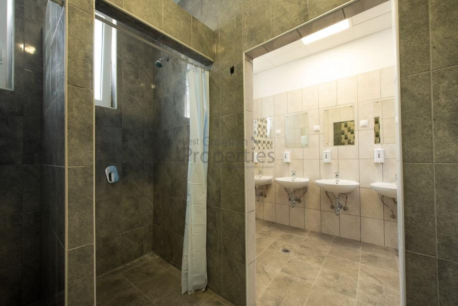 Ulaskom na glavni ulaz dolazimo na recepciju koja se nalazi u prostranom hodniku koji najprije vodi do 6 soba, svaka s 2 jednokrevetna ležaja i televizorom. Zatim dolazimo do velike spavaonice s 12 jednokrevetnih ležaja. U nastavku hodnika nalaze se sanitarni čvorovi, još 2 sobe sa po 2 ležaja te blagovaonica s nekoliko stolova iz koje izlazimo na prostranu terasu.U prizemlju se dodatno nalazi još 9 soba sa po 2 jednokrevetna ležaja. Svaka odtih soba ima televizor te vlastitu kupaonicu, a u nastavku hodnika se također nalaze zajednička kuhinja i blagovaonica, čija vrata vode natrag na recepciju.Unutarnjim stepenicama penjemo se na kat na kojem se s lijeve strane nalazi veliki zajednički sanitarni čvor, a s desne strane još 12 soba, svaka s dva jednokrevetna ležaja i televizorom. Hodnik vodi na prostranu terasu, idealnu za upijanje sunčevih zraka.Ulaz u prizemlje moguć je sa glavnog ulaza, te još jednog dodatnog ulaza s bočne strane objekta.