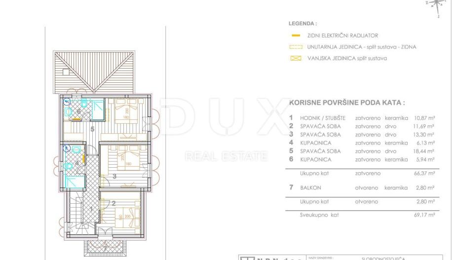 Unutarnje stepenice vode na gornju etažu površine 66.37 m2, gdje se nalazi hodnik, tri komforne spavaće sobe, te dvije kupaonice, od čega master spavaća soba ima vlastitu kupaonicu, dok je druga kupaonica u hodniku i ona je zajednička za preostale dvije sobe.