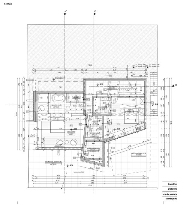 Na prvoj etaži nalaze se hodnik, tehnička soba, vešeraj, strojarnica, , dodatni toalet, prostrana master soba sa master kupaonicom i izlazom na terasu, druga spavaća soba sa kupaonicom i terasom.
