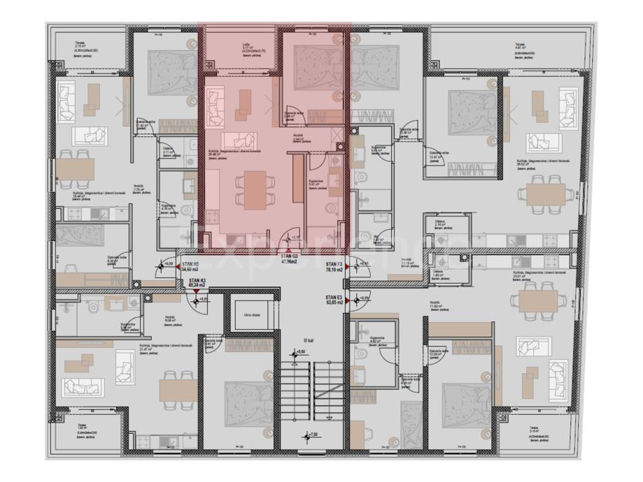Na prodaji je dvosoban stan, površine 47,96 m². Stan se nalazi na trećem katu stambene zgrade. Sadrži: otvoreni i svijetao prostor u kojem su smješteni dnevni boravak, blagovaonica i kuhinja sa izlazom na lođu, spavaću sobu i kupaonicu.