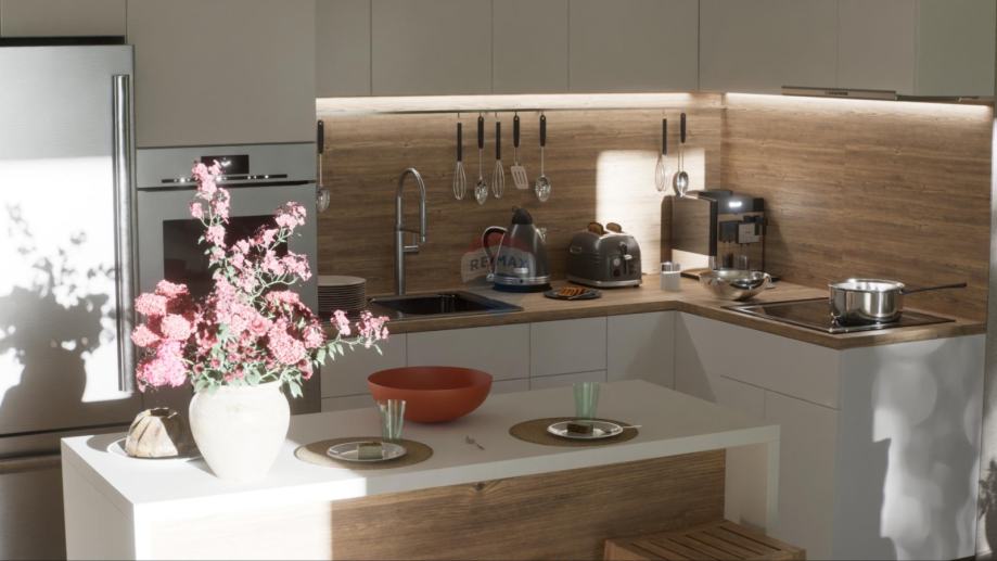 Stan se sastoji od kuhinje, blagovaone i dnevnog boravka otvorenog koncepta, kupaonice te dvije spavače sobe.