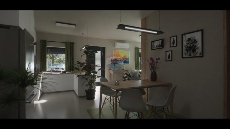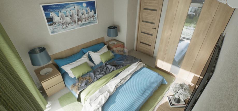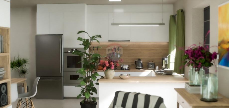 vlasništvo. Stan se sastoji od kuhinje, blagovaone i dnevnog boravka otvorenog koncepta, kupaonice te dvije spavaće sobe. Iz dnevnog prostora se kroz velika balkonska vrata
