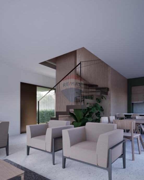 U prizemlju na idejnom projektu nalazi se kupaona za goste, vešeraj , kuhinja s blagovaonom te velika dnevna soba u open space konceptu. Na okućnici kvadrature 800 m2 smjestio bi se bazen te ljetna kuhinja s nadstrešnicom za uživanje u ljetnim mjesecima.
