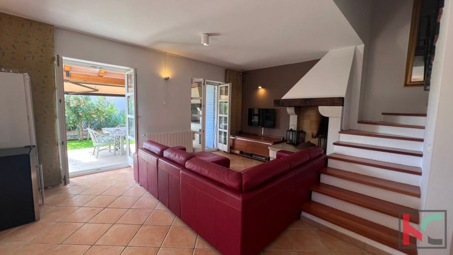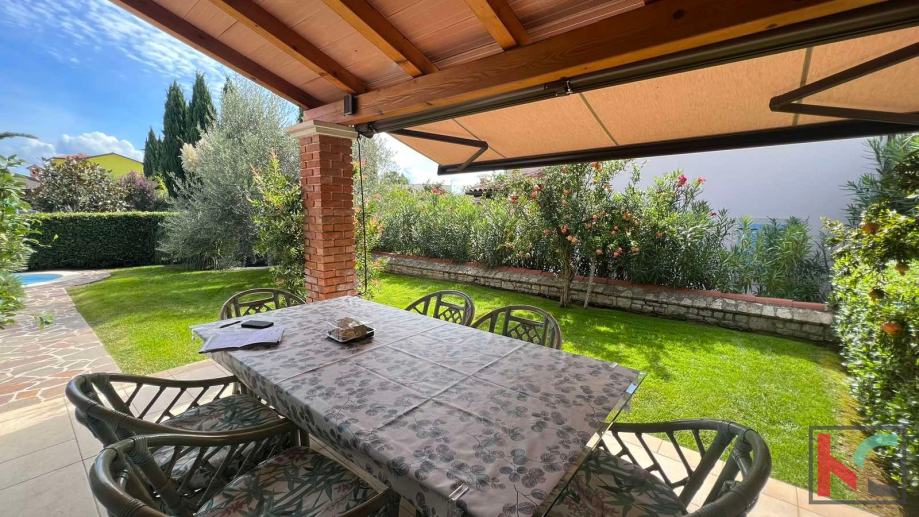 Iz dnevnog boravka i blagovaone izlazi se na prostranu natkrivenu terasu od 36m2 (ljetna kuhinja i roštilj), uređen travnjak s navodnjavanjem i bazen dimenzija 4x8m okružen niskim kamenim zidom i zelenilom te sauna. Uz kuću se nalaze dva parkinga u vlasništvu.