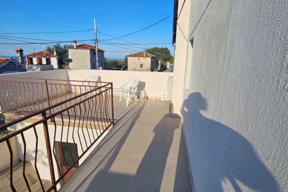 Tri prostrane terase sa pogledom na more te jedna natkrivena terasa u prizemlju. U dvorištu je parking za 12 automobila.