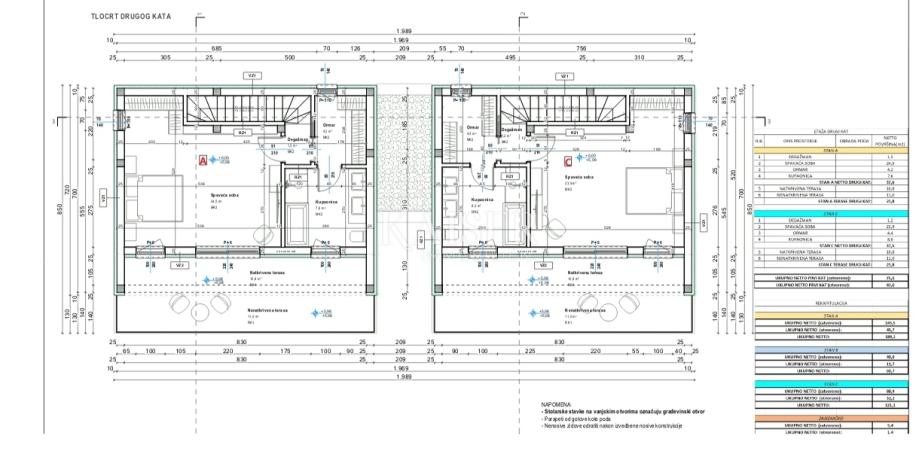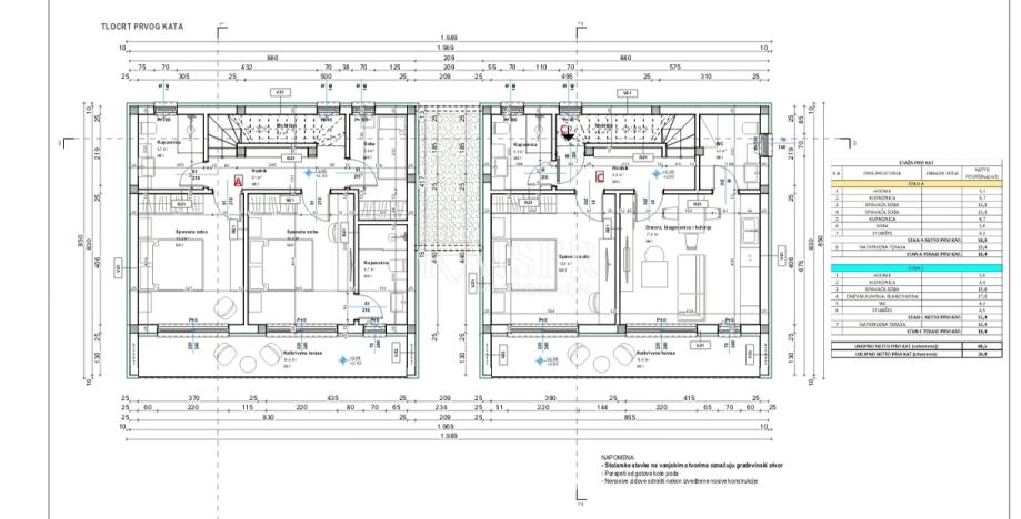 Površina kuće iznosi 190 m2 neto, od toga stambeno je 150m2 a 45 m2 su terase.