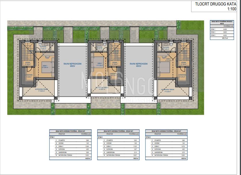 Na prvom katu smještene su dvije spavaće sobe, hodnik i kupaonica. Drugi kat nudi master spavaću sobu s walk-in ormarom, kupaonicom i natkrivenom terasom od 12,63 m2.