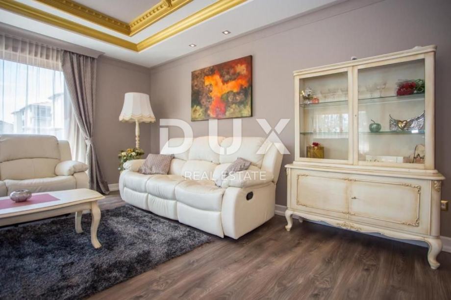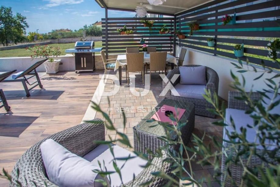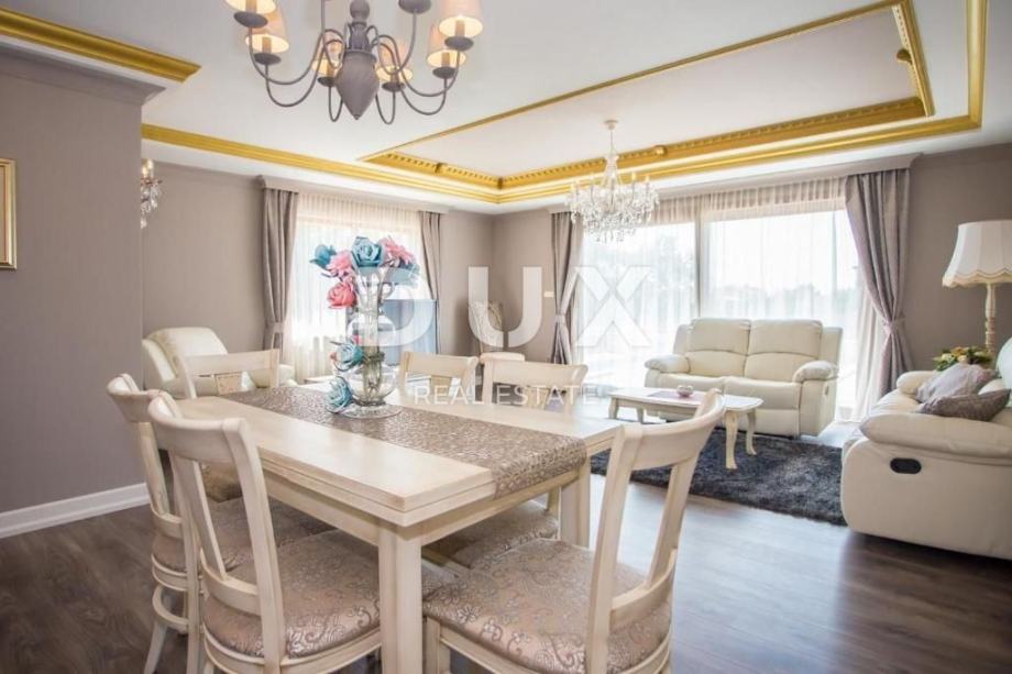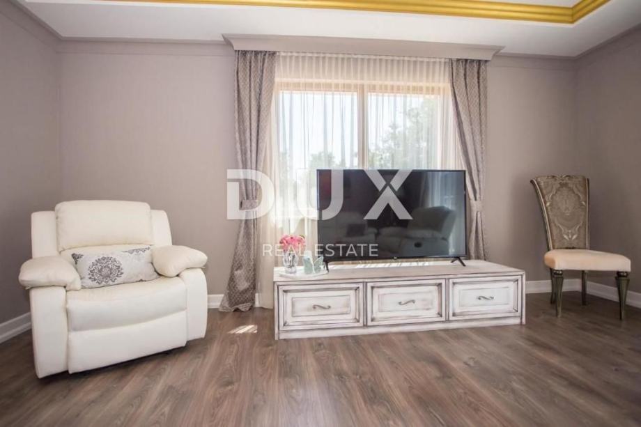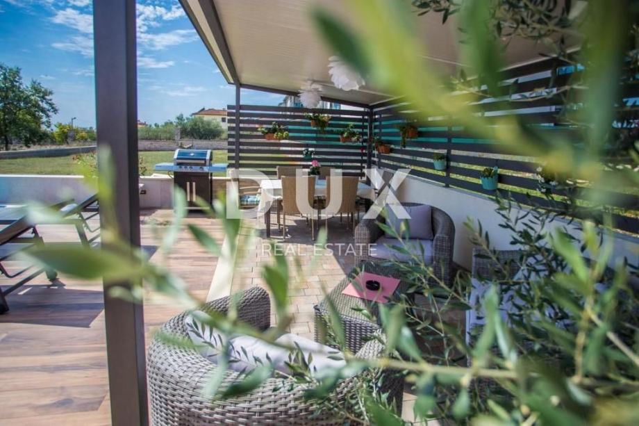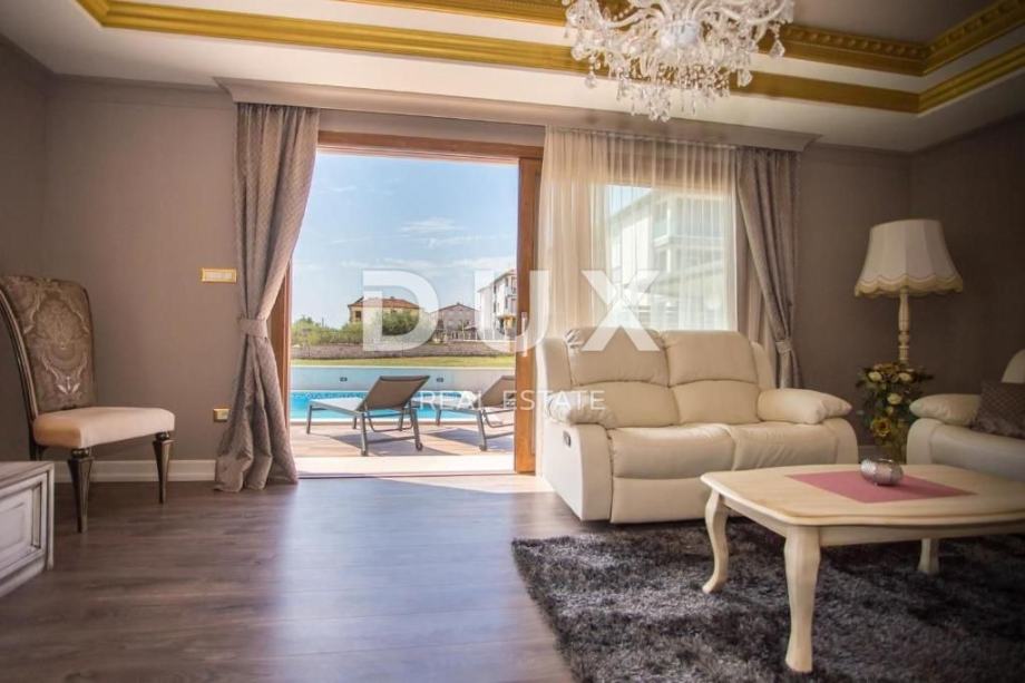 Iz dnevnog boravka se dalje proteže izlaz kroz kliznu staklenu stijenku na prostor uređenog dvorišta i bazena sa sunčalištem.
