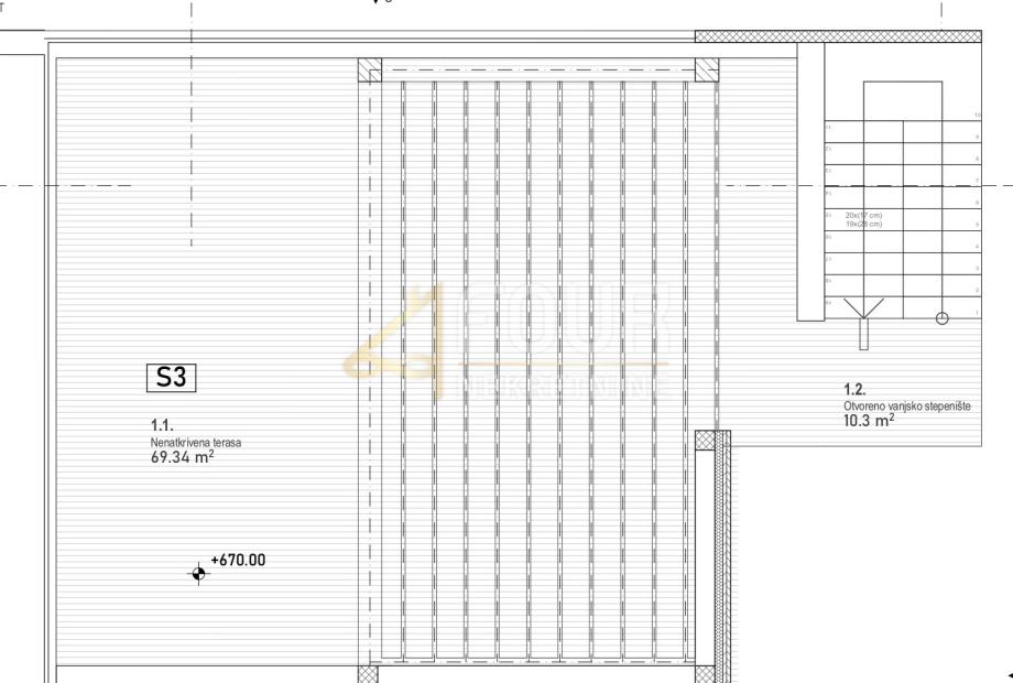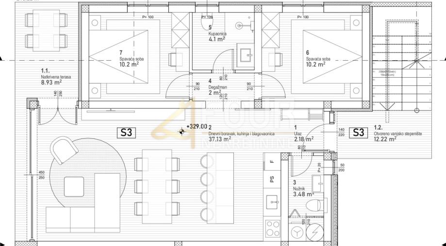 Stan se sastoji od dvije spavaće sobe, prostranog dnevnog boravka, kuhinje s blagovaonicom, dvije kupaonice, degažmana te natkrivene terase, koja je savršeno mjesto za uživanje u vanjskom prostoru. Dodatno, stan nudi impresivnu krovnu terasu površine 69.34m2 koja pruža nevjerojatan pogled na more i okolnu prirodu – idealna za opuštanje i zabavu.