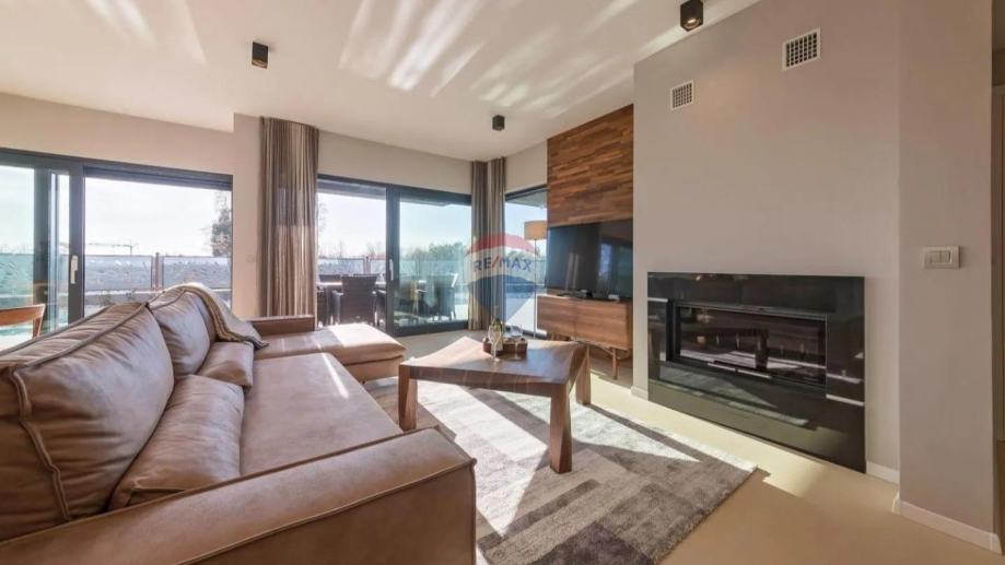 Prizemlje očarava prostranim i iznimno svijetlim dnevnim prostorom otvorenog koncepta koji se nastavlja na pažljivo uređeno dvorište. Dnevni boravak s Palazzetti kaminom pruža poseban ugođaj topline i elegancije, dok kuhinja i blagovaonica, zajedno s gostinjskim toaletom, čine skladnu i funkcionalnu cjelinu s pogledom na vanjski prostor. U središtu dvorišta smješten je bazen kao glavna vizualna i ambijentalna atrakcija, uz natkrivenu terasu i vanjsku kuhinju koje omogućuju ugodan boravak i druženja tijekom cijelog ljeta.