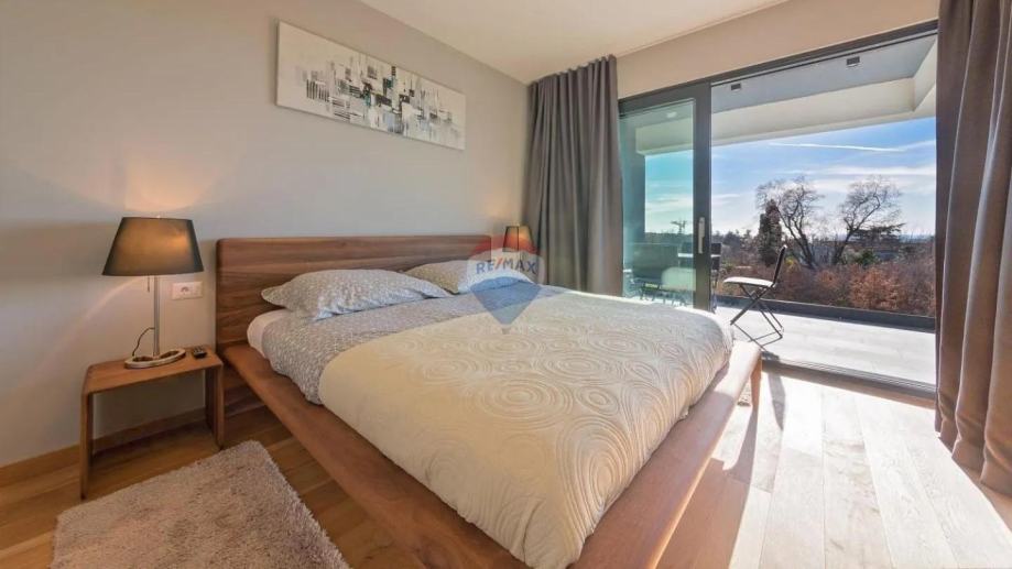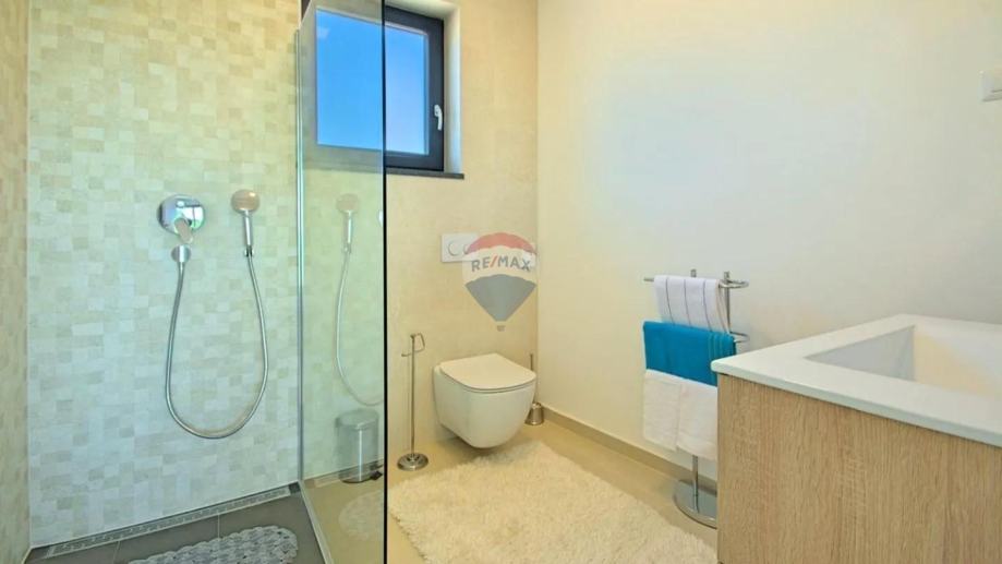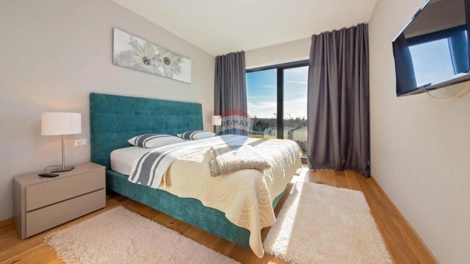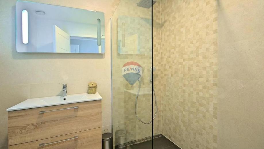 Na katu su smještene tri prostrane spavaće sobe, svaka sa svojom kupaonicom i privatnim balkonom, pružajući potpunu udobnost i privatnost svim članovima obitelji ili gostima. Posebnu vrijednost ovoj nekretnini daje krovna terasa uređena kao sunčalište s jacuzzijem i vanjskim tušem, s koje se pruža očaravajući pogled na okolinu, grad i more koji doslovno oduzima dah.