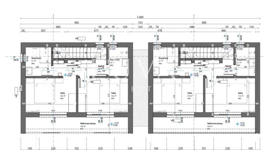 - Dvije spavaće sobe, svaka s vlastitom kupaonicom i izlazom na balkon