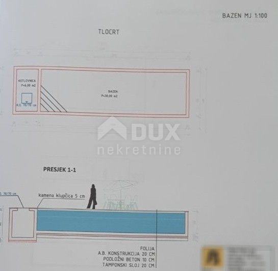 Uz kuću dolazi vanjski grijani bazen površine 30 m2, koji se zagrijava dizalicom topline, a podloga u bazenu bit će prekrivena folijom. Ulaz u bazen će biti putem betonskih stepenica.