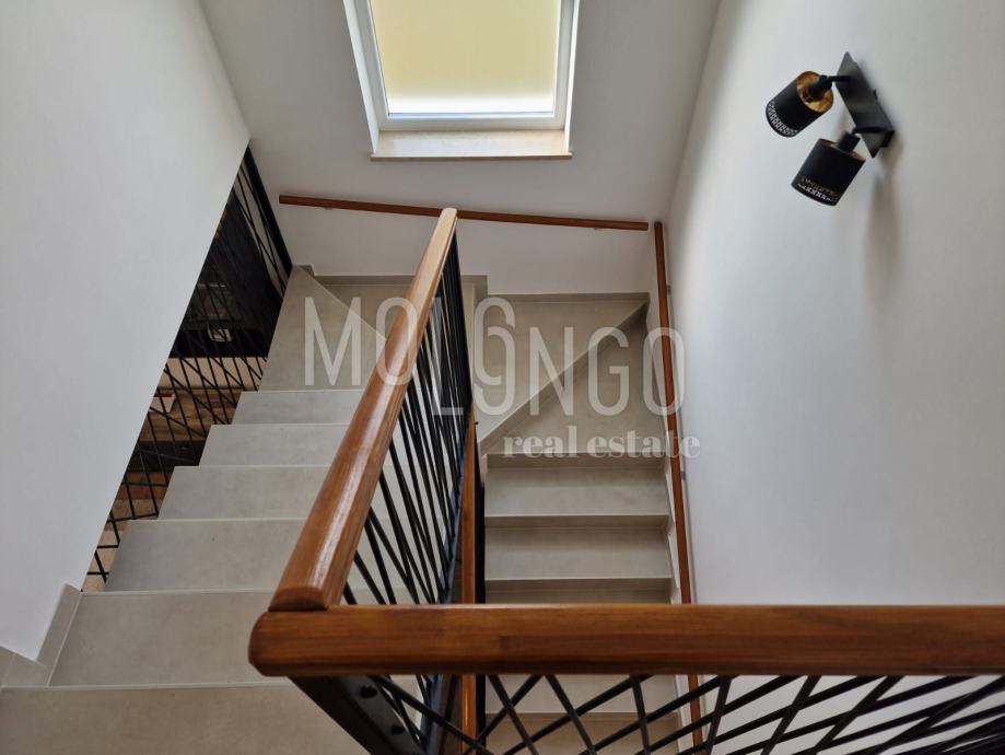 Elegantno stubište vodi nas na prvi kat kuće, gdje se nalaze još dvije prostrane spavaće sobe. Ove sobe imaju izlaz na zajedničku terasu koja pruža spektakularan pogled na okolnu šumu i jednim dijelom na more. Ova terasa je savršeno mjesto za opuštanje uz jutarnju kavu ili uživanje u zalasku sunca s predivnim prirodnim pejzažem u pozadini.