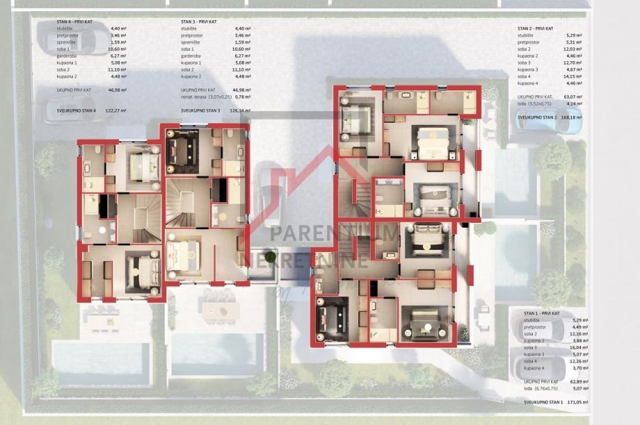 Prvi kat (46,98 m²): Dvije udobne spavaće sobe, dvije moderne kupaonice, garderoba i spremište, te nenatkrivena terasa za uživanje u jutarnjoj kavi.