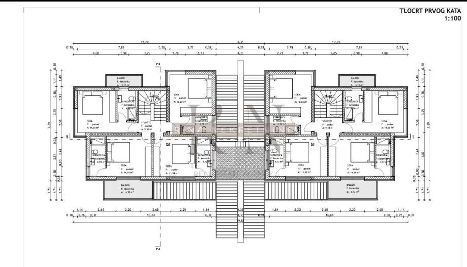 Prvi kat nudi četiri spavaće sobe s vlastitim kupaonicama i dva balkona, čime je osigurana privatnost i komfor.