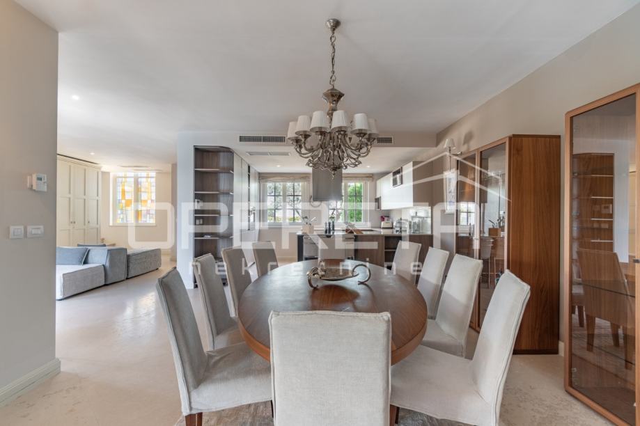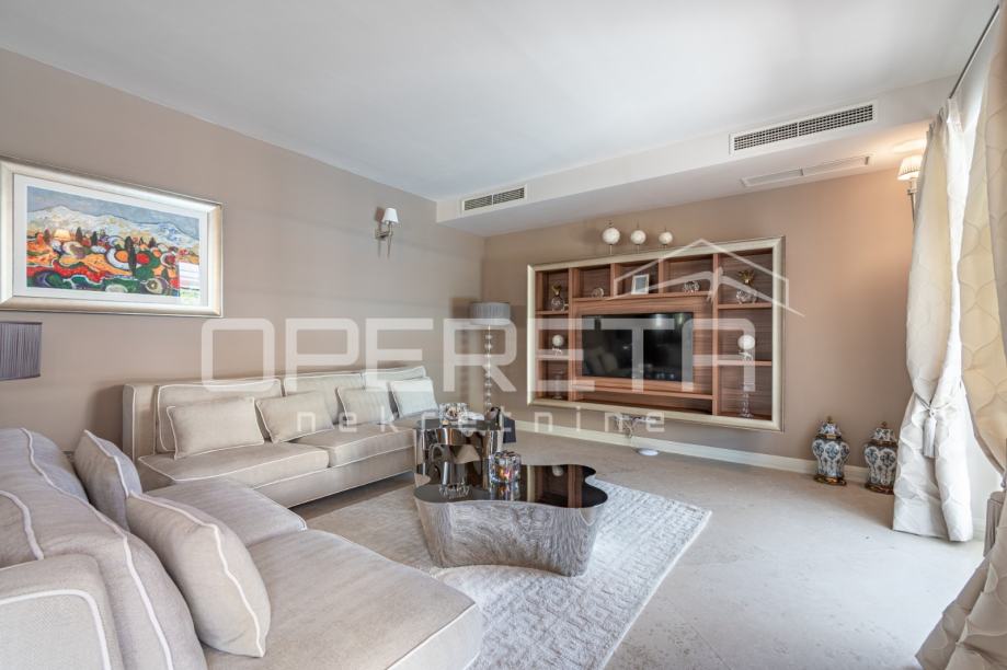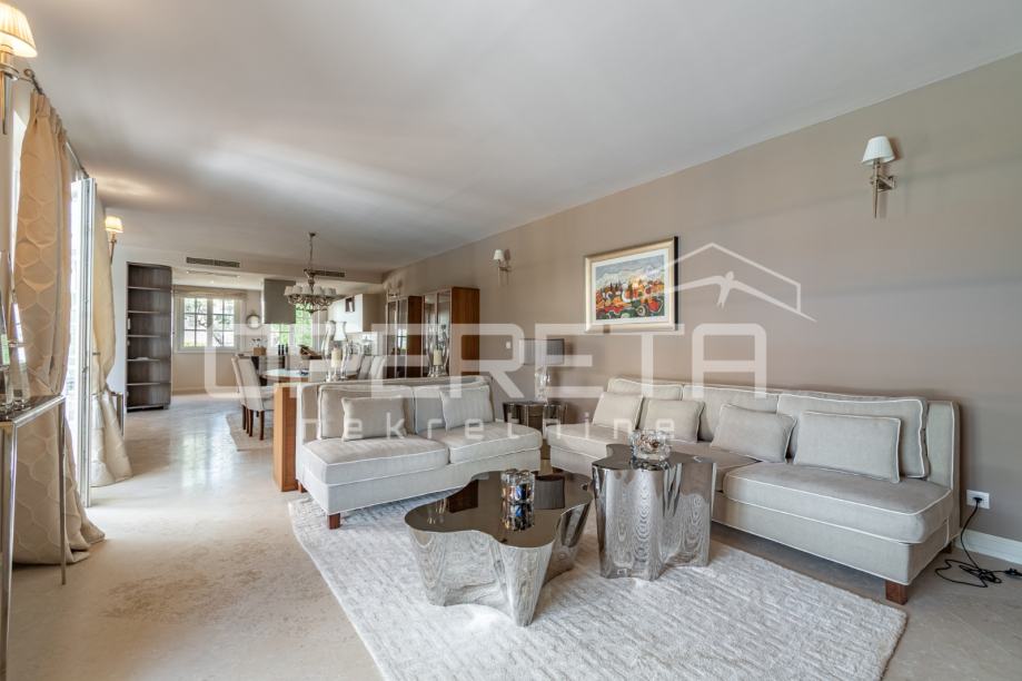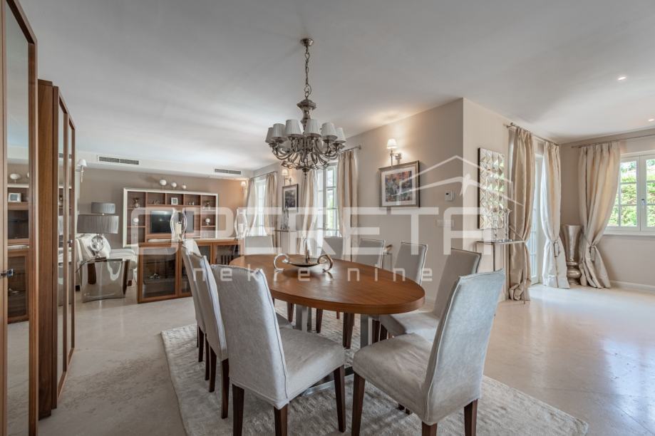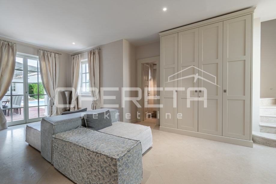 U prizemlju vile dočekuje vas elegantan ulazni hodnik koji vodi u impresivan open space koncept. Ovdje se savršeno spajaju vrhunski opremljena kuhinja s modernim Miele aparatima, prostrana blagovaonica i svijetao dnevni boravak. Iz dnevnog boravka omogućen je direktan izlaz na prostrano sunčalište i predivno uređen vrt, gdje dominira osvježavajući bazen dimenzija 8x4 metra, idealan za opuštanje i uživanje u toplim danima.
