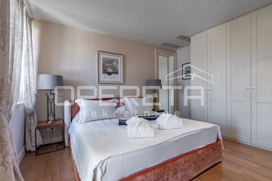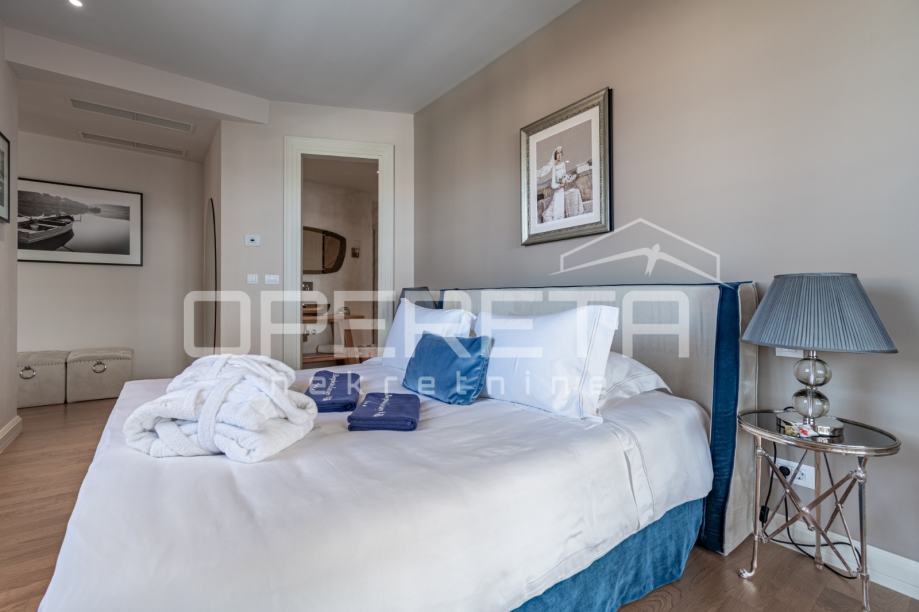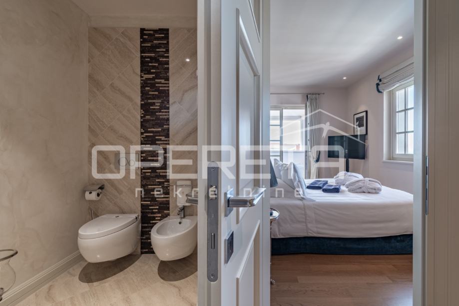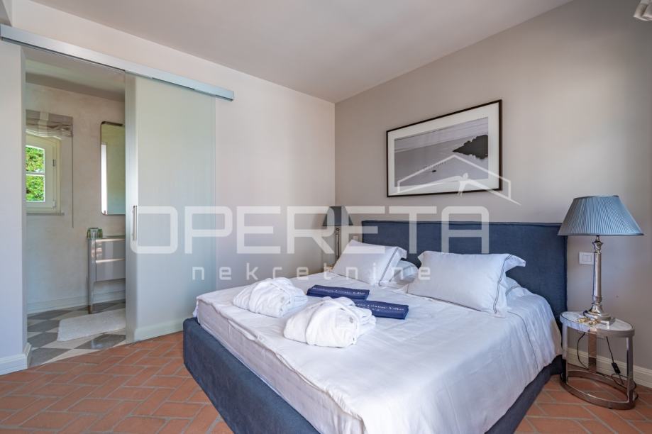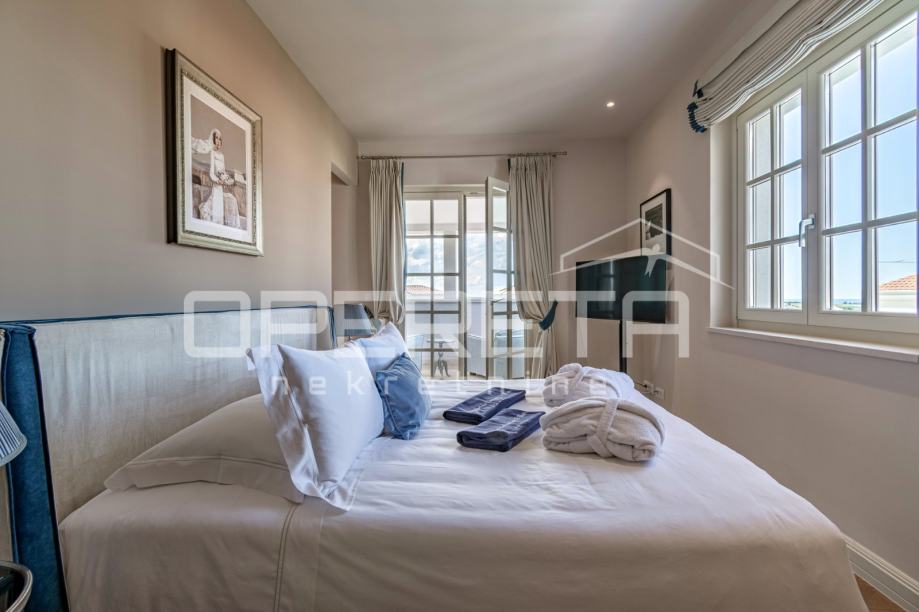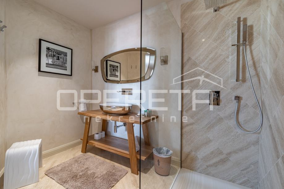 Kamene stepenice vode na prvi kat, gdje su smještene dvije prostrane spavaće sobe, svaka sa svojom luksuznom kupaonicom, nudeći maksimalnu privatnost i komfor. Posebna pogodnost ove vile je i predivna krovna terasa s koje se pruža očaravajući pogled na more, idealna za jutarnju kavu ili večernja druženja pod zvijezdama.