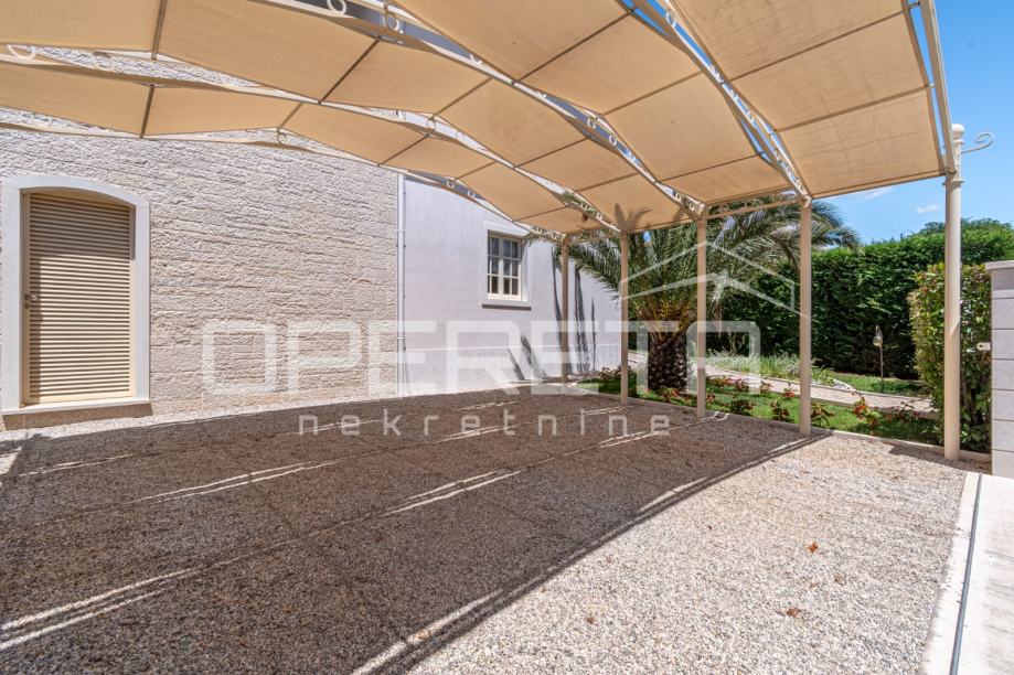 Poseban naglasak stavljen je na upotrebu prirodnih materijala koji doprinose bezvremenskom šarmu i kvaliteti gradnje. Drveni prozori i elegantno obloge od prirodnog kamena na fasadi savršeno se uklapaju u mediteranski ambijent, osiguravajući dugotrajnost i estetsku privlačnost.