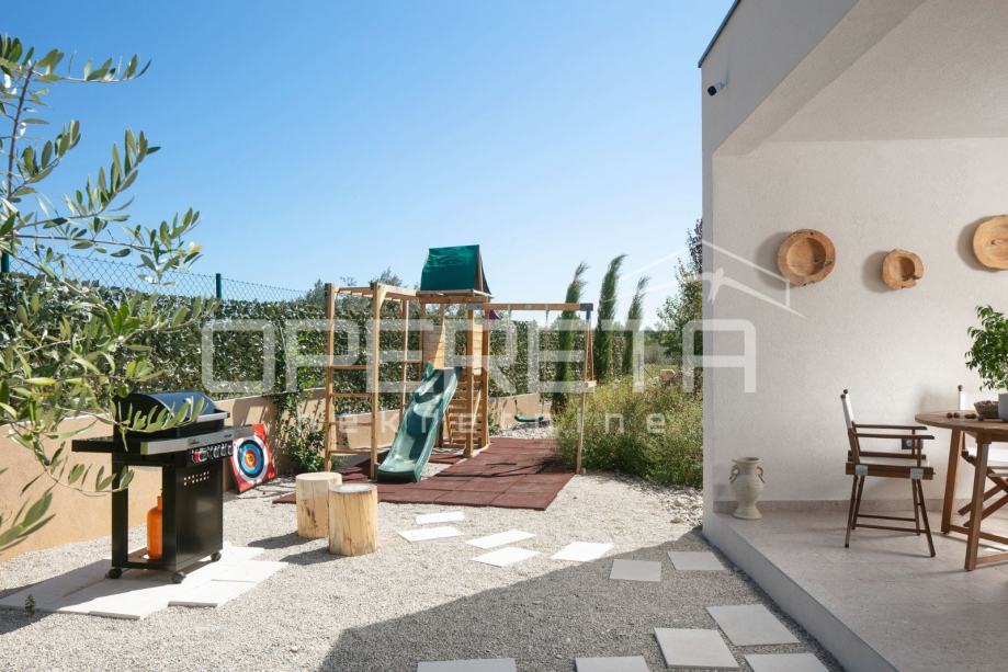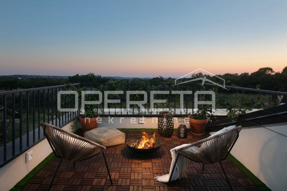 Dodatnu vrijednost pruža prostrana krovna terasa s koje se pruža predivan pogled na more i okolni krajolik, dok je na donjem dijelu terena osigurana sva infrastruktura s provedenim instalacijama struje, vode i septičke jame.