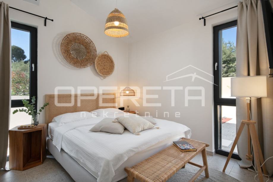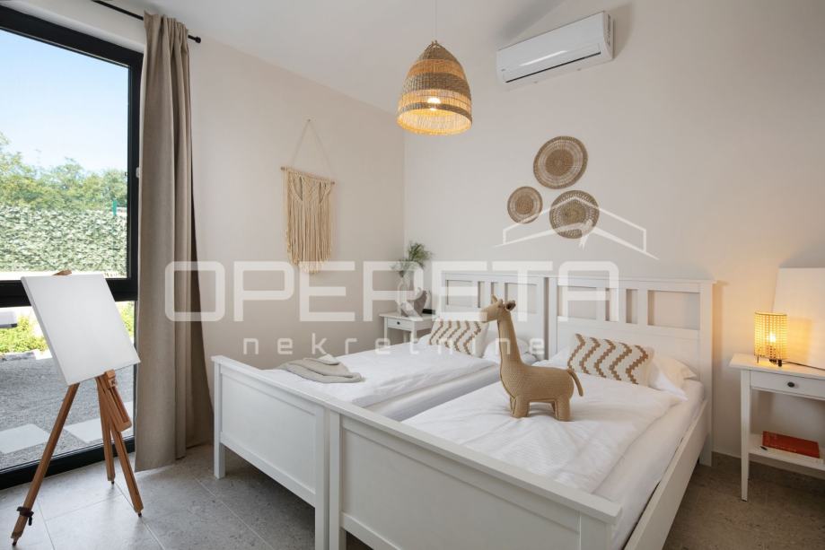 Sa svojih 103 m2 površine, sastoji se od dvije spavaće sobe i dvije kupaonice, te kuhinje i blagovaonice u open-space rasporedu. Nekretninu krasi velika i lijepo održavana okućnica od cca 1200 m2, na kojoj se nalazi bazen od 47 m2.