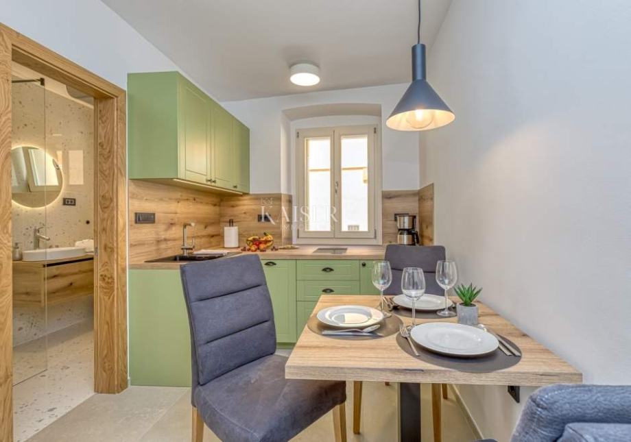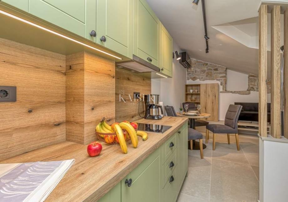 Ova jedinstvena nekretnina veličine je 120 m2, te se sastoji od prizemlja i tri kata. Katovi su uređeni kao apartmani, svaki za sebe te se kao takva, apartmanska nekretnina ljeti uspješno iznajmljuje. Apartman u prizemlju i na prvom katu sastoji se od odvojene spavaće sobe s bračnim krevetom i krevetom za jednu osobu, kuhinje s blagovaonom, te kupaonice opremljene tušem.