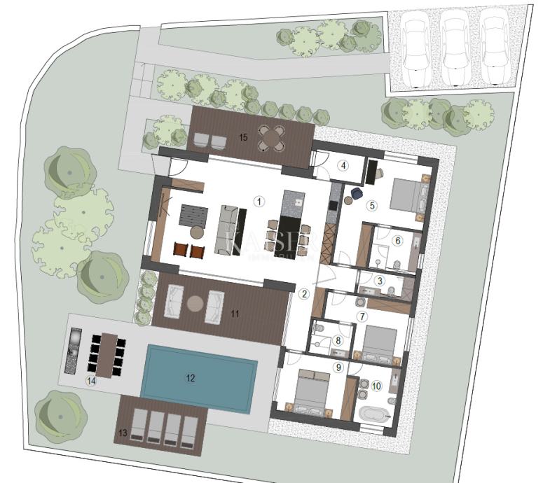 Vanjski dio vile stvoren je za vaš užitak. Doslovno – bilo da odaberete bazen, sunčalište, jednu od dvije terase s dnevnim boravkom ili mjesto u vanjskoj kuhinji, bit će to pravi užitak. S vanjske strane ove zone uživanja je šuma i zelenilo koje izdvaja ovu vilu u svoj mali raj.