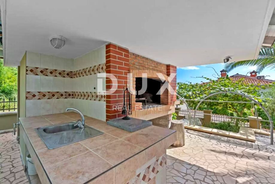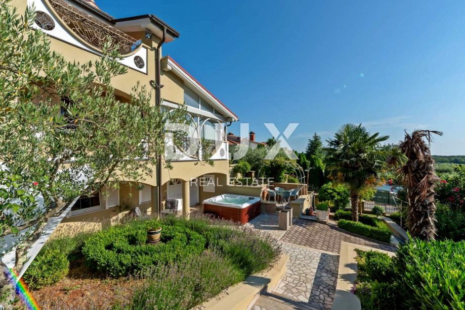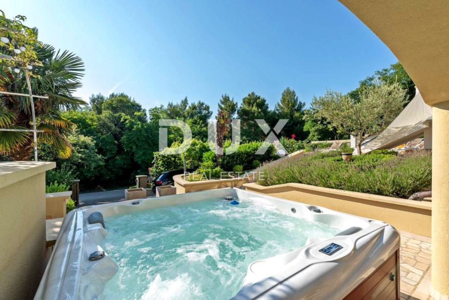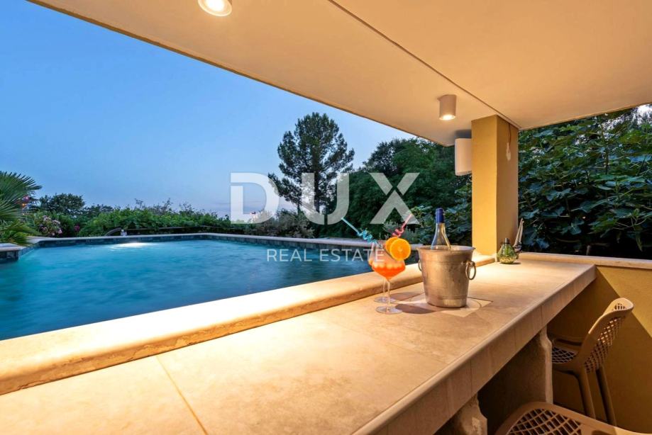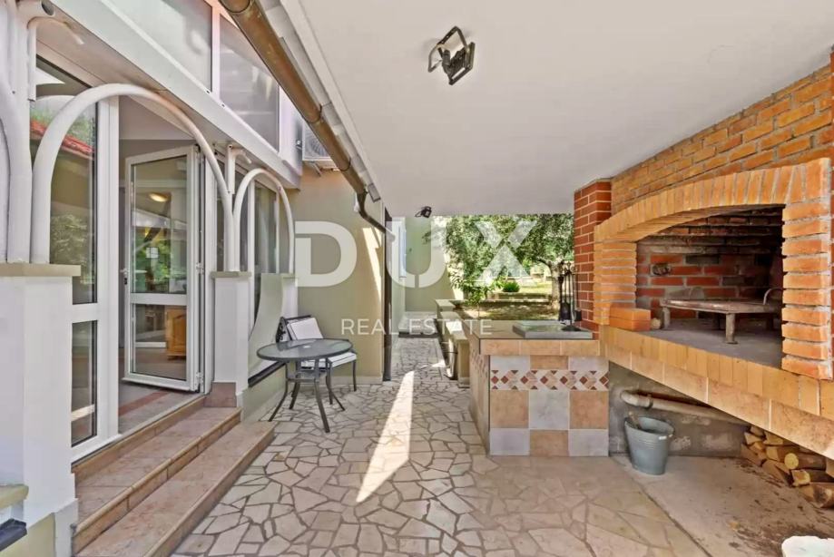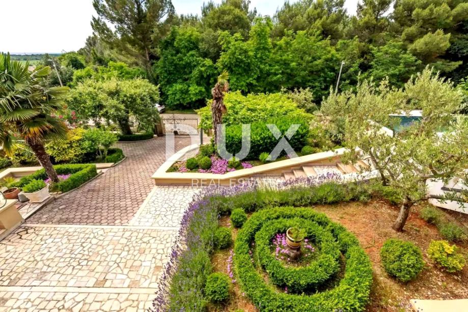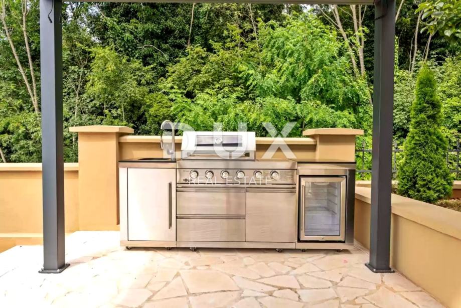 Prostrana okućnica koja obiluje zelenilom i cvijećem i raslinjem je ograđena i uređena do najsitnijeg detalja a savršen sklad zaokružuje bazen sa sunčalištem i elegantno ukomponiranom lounge zonom i natkrivena ljetna kuhinja.