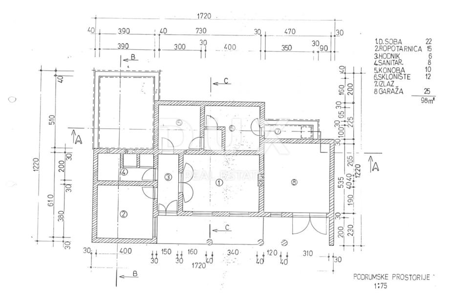 Suteren se sastoji od garaže, spremišta, kotlovnice i stambene jedinice koja se sastoji od dnevnog dijela koje ujedinjuje kuhinju, blagovaonicu i dnevni boravak, spavaće dobe i kupaonice.