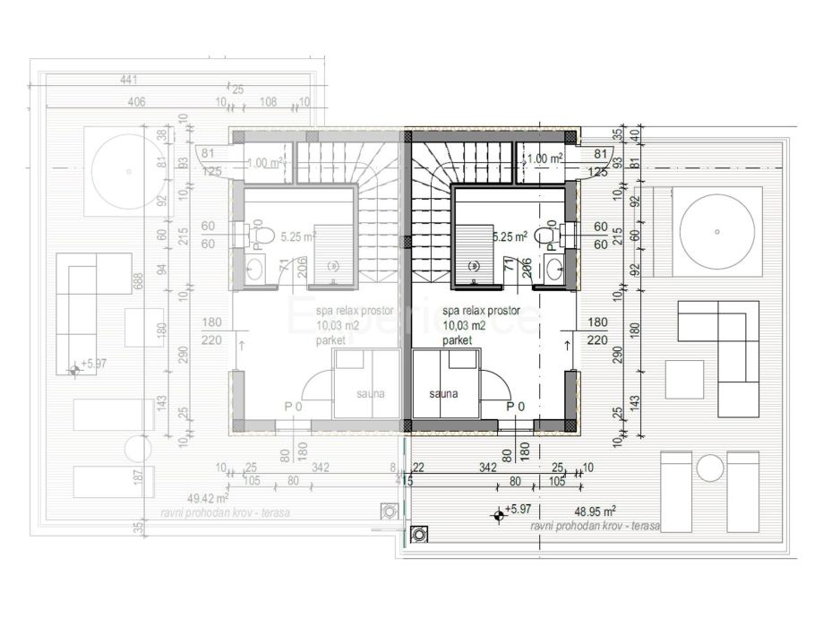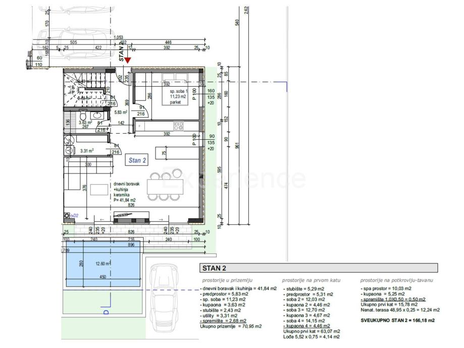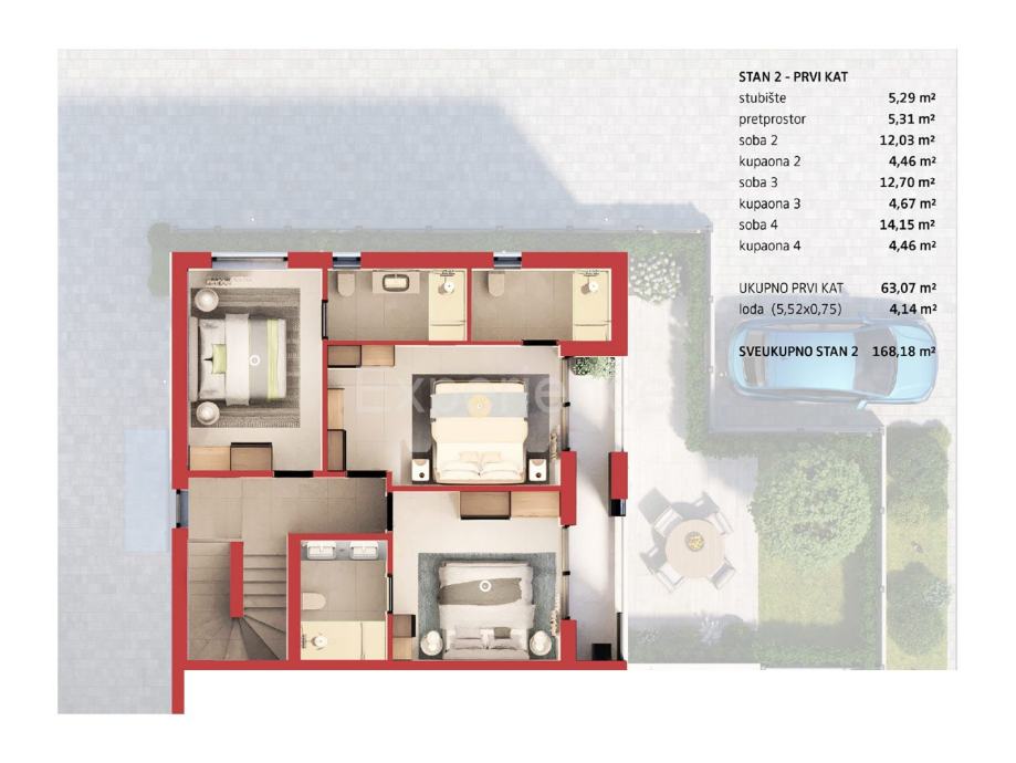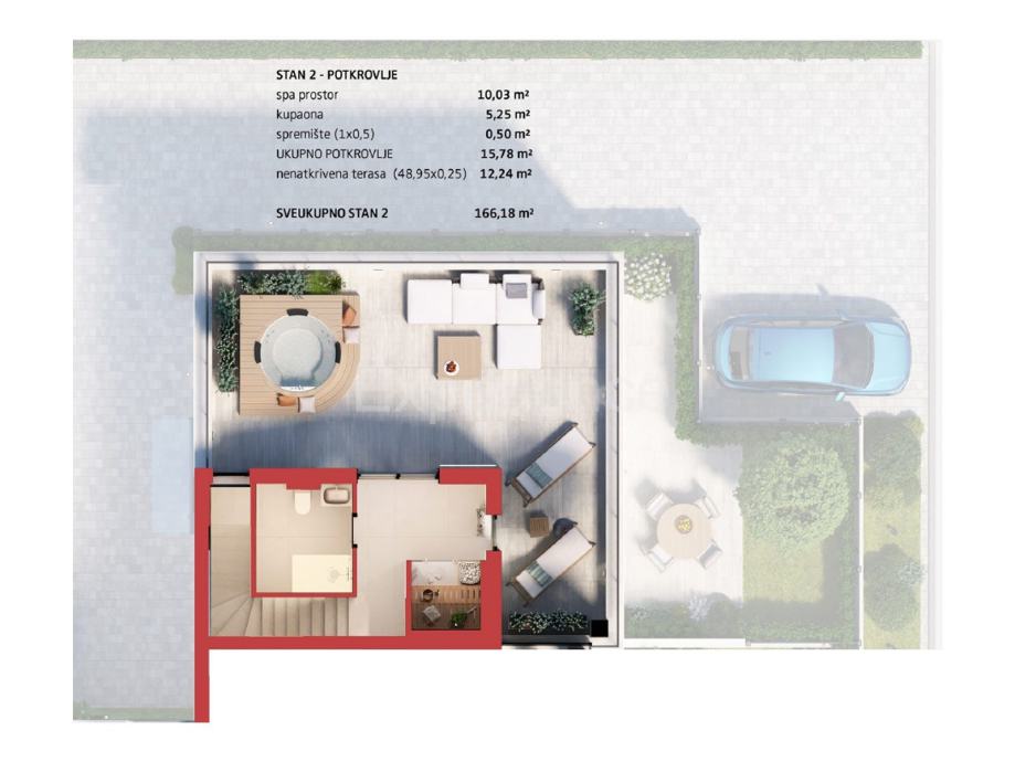Raspored prostorija:• Prizemlje: Predsoblje, open space koncept dnevnog boravka, kuhinje i blagovaonice sa izlazom na natkrivenu terasu i vrt, spavaću sobu, kupaonicu, praonicu i spremište,• Prvi kat: tri udobne spavaće sobe, svaka s vlastitom kupaonicom – dvije spavaće sobe saizlazom na balkon (5,52 m²), • Potkrovlje: SPA relax prostor sa saunom, kupaonicom i prostranom krovnom terasom (48,95 m²) sa priključkom za jacuzzi, koja je orijentirana prema zapadu, savršeno mjesto sa pogledom na zalazak sunca.