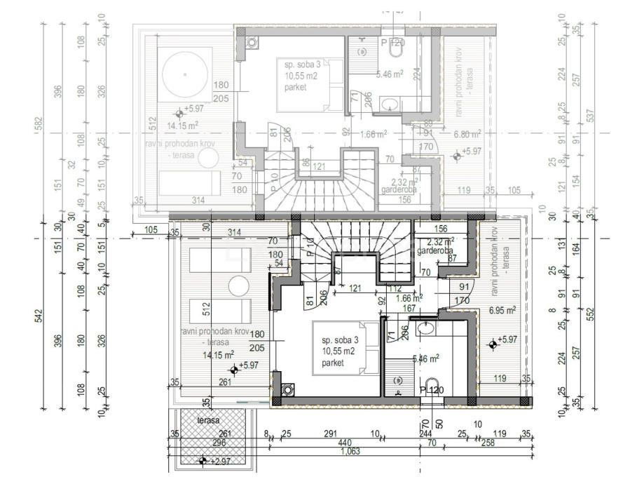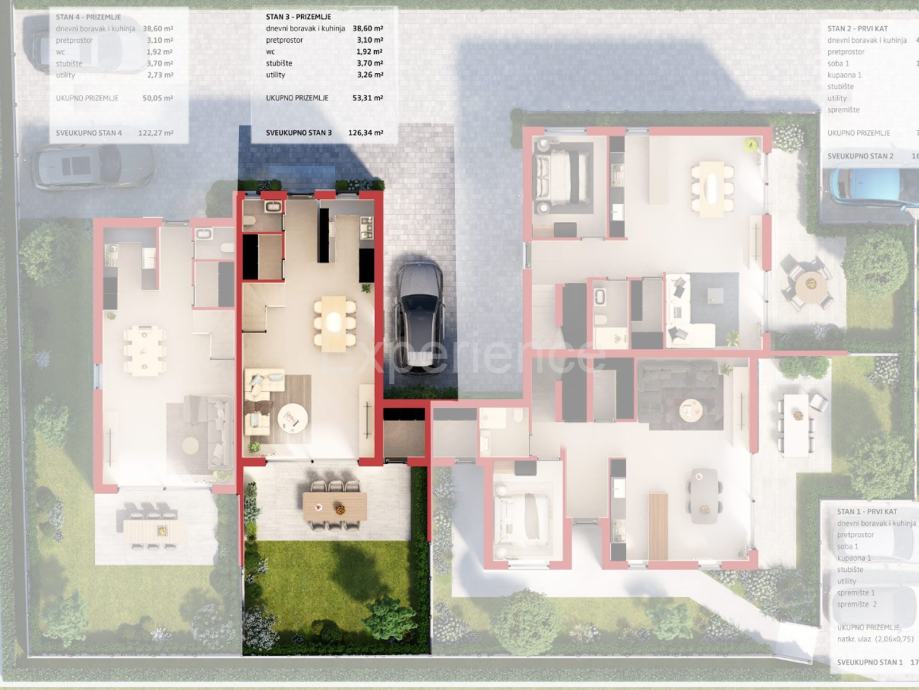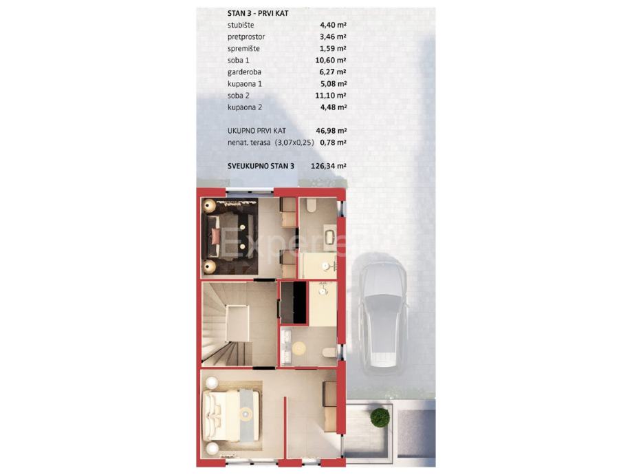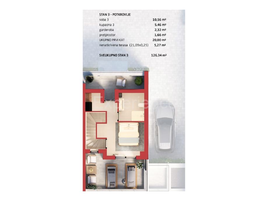Raspored prostorija:• Prizemlje: Predsoblje, open space koncept dnevnog boravka, kuhinje i blagovaonice sa izlazom na natkrivenu terasu i vrt, toalet i dva spremišta.• Prvi kat: dvije udobne spavaće sobe, svaka s vlastitom kupaonicom – jedna spavaća soba sa garderobom i izlazom na terasu (3,07 m²), te spremište.• Potkrovlje: Treća spavaća soba sa vlastitom kupaonicom i garderobom, te dvije terase – jedna orijentirana prema zapadu (14,15 m²), savršeno mjesto za pogled na zalazak sunca, i druga prema istoku (6,95 m²).