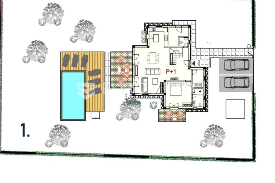 In Istria, not far from Poreč, there is a beautiful detached house with a large garden of 1,036 m2. The house is spread over 2 floors, with a net area of 147m2: Ground floor: entrance hall, guest toilet, laundry room, open space kitchen, dining room and living room with access to the terrace with...