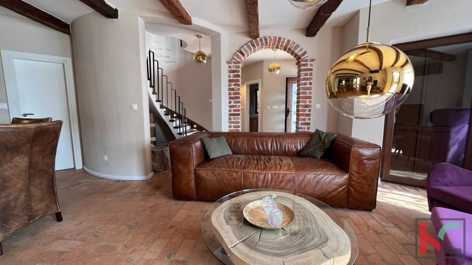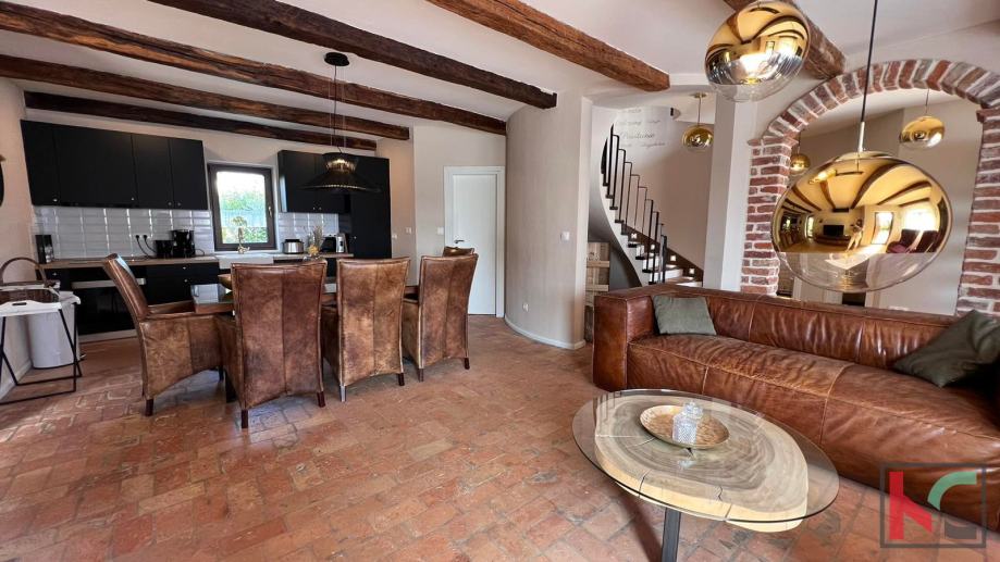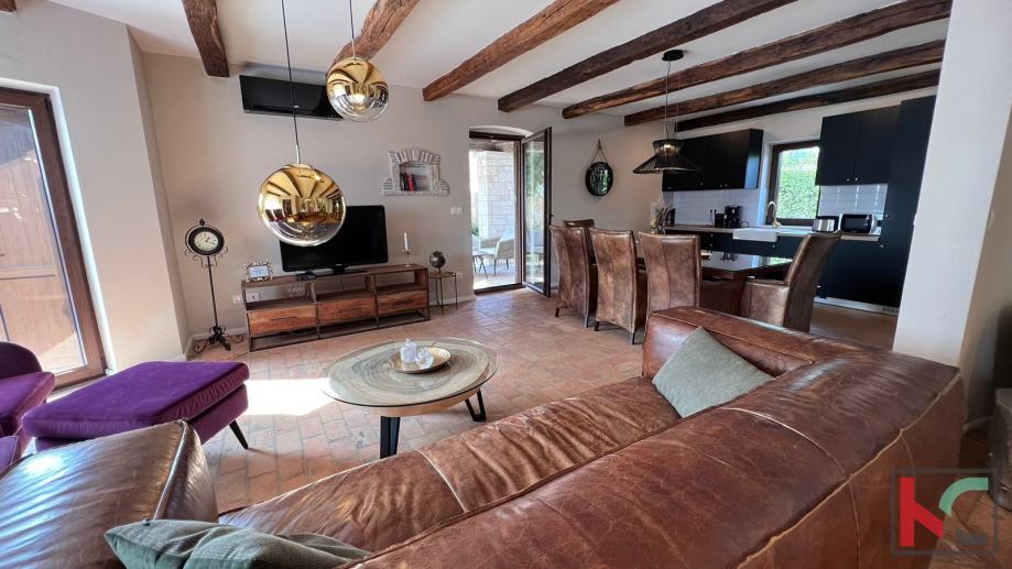 U prizemlju kamene ville nalazi se "open space" kuhinja sa blagovaonom i dnevnim boravkom s izlazom na terasu gdje se nalazi ljetna kuhinja s kaminom, spavaća soba, kupaonica, wc i spremište, dok se spavaći dio smjestio na prvom katu sa tri spavaće sobe, od čega jedna ima kupaonicu i terasu, predsoblje te dodatna kupaonica na katu.