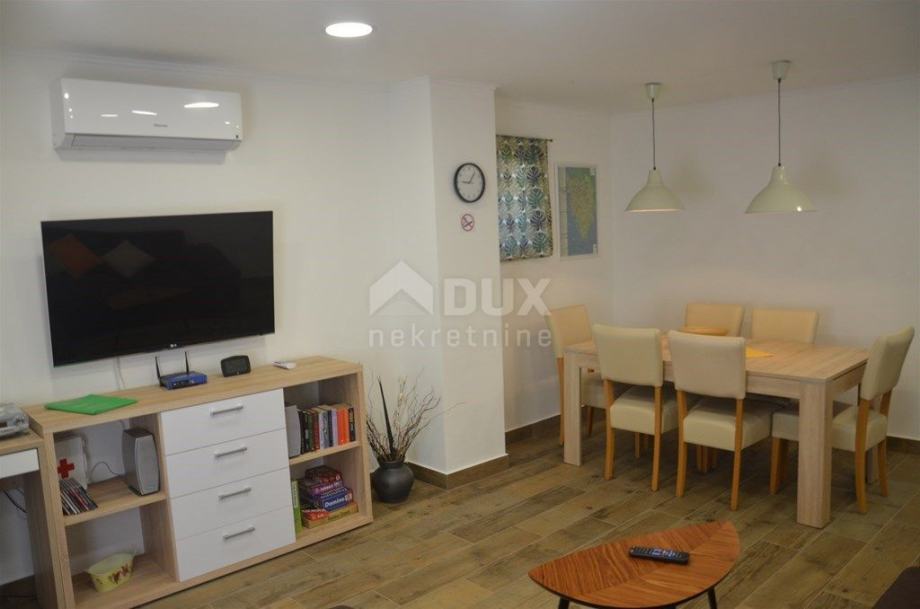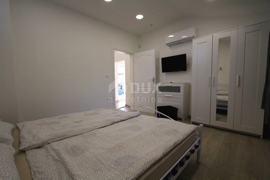 U prizemlju kuće nalazi se ulazni hodnik, spavaća soba sa kupaonicom, dnevni boravak sa blagovaonskim dijelom, potpuno opremjena kuhinja sa izlazom na dvorište gdje se nalazi natkrivena ljetna kuhinja i bazen.