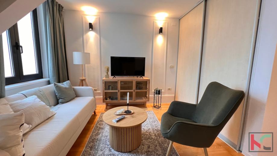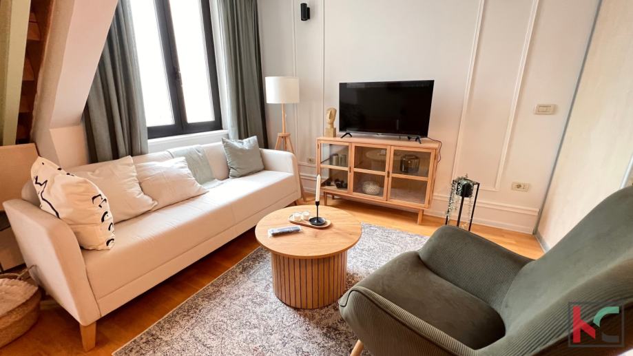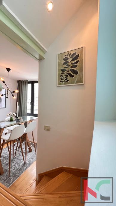 Stan je kompletno uređen te stilski namješten, od kvalitetnog hrasta unutarnje stepenište, parket u dnevnom i spavaćem djelu, aluminijska stolarija, protuprovalna vrata, kvalitetna kuhinja te sanitarije i divan namještaj s detaljima koji upotpunjuje izgled ovog industrijalno-urbanog stana sa prizvukom retro šarma.