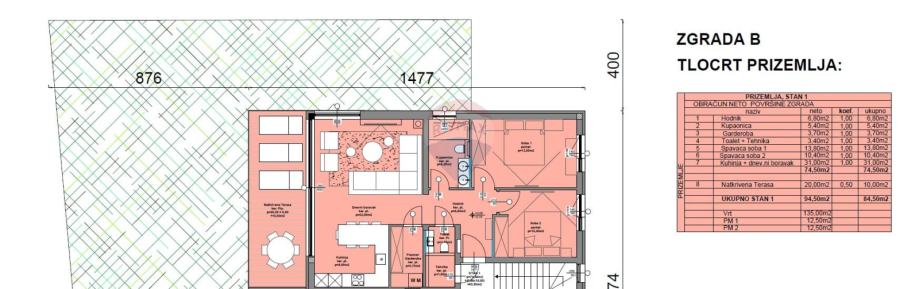 Površina: 94,5 m² plus 135 m2 okućnice.