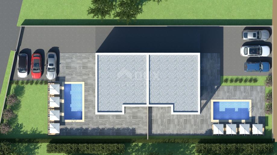 U prizemlju će se nalaziti ulazni prostor, utility room, gostinjski wc, kupaonica, jedna spavaća soba, kuhinja sa blagovaonom i dnevnim boravkom u open space konceptu. Iz dnevnog boravka bit će omogućen izlaz na natkrivenu terasu te sunčalište i bazen.