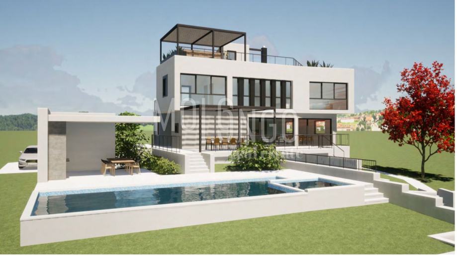 Ova impozantna vila proteže se kroz tri razine, nadopunjene krovnom terasom koja pruža zadivljujuće panoramske pejzaže.