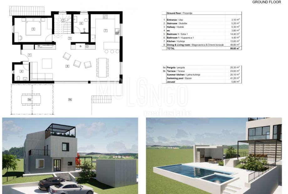 Prizemlje ove elegancije sastoji se od ulaznog trijema, hodnika sa stubištem, gostinjskog wc-a, spavaće sobe, kupaonice, moderno opremljene kuhinje te prostranog dnevnog boravka koji se otvara prema blagovaonici kao otvoreni koncept. Direktni izlaz s ovog područja vodi prema prostranoj terasi s pergolom, koja će vam pružiti uživanje u prirodnom okruženju uz spektakularne poglede na more.