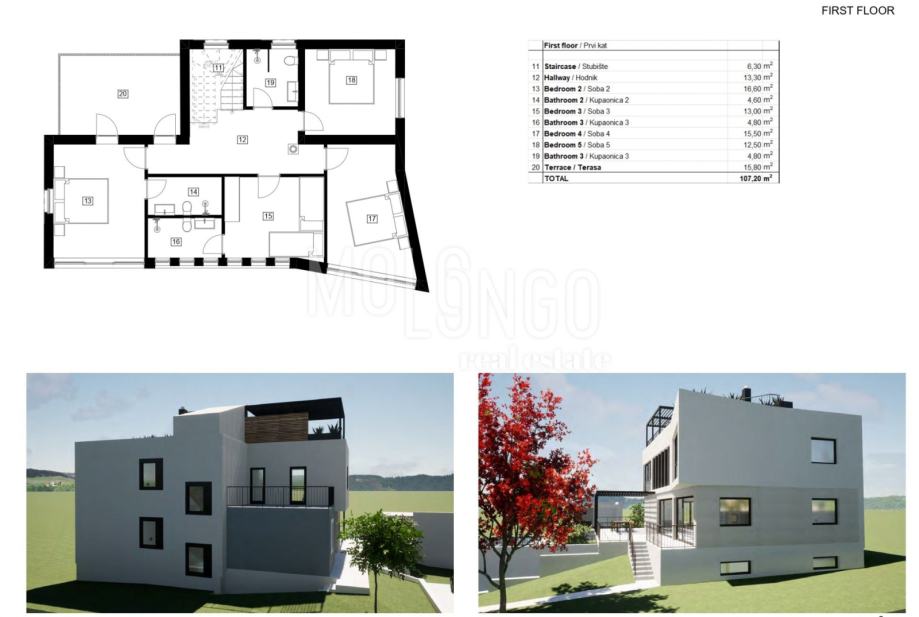Prvi kat ove raskošne vile obuhvaća hodnik, četiri elegantno uređene spavaće sobe te tri kupaonice. Dvije spavaće sobe imaju svoje privatne kupaonice, dok preostale dvije dijele jednu kupaonicu. Velika terasa površine 15.80 m², povezuje se s jednom od spavaćih soba i pruža zadivljujući pogled na okoliš.
